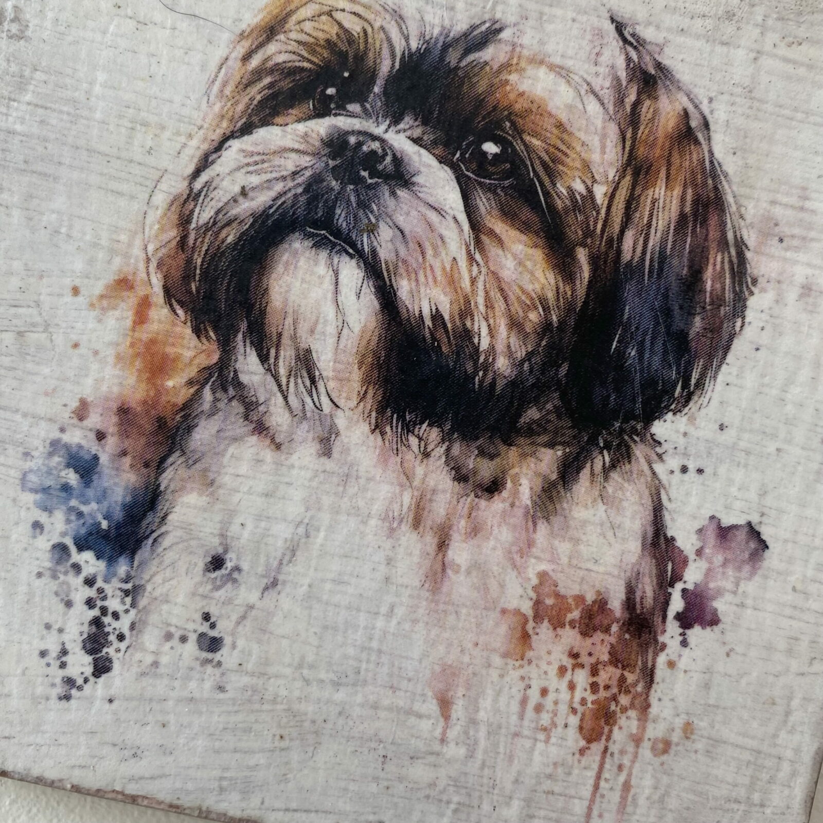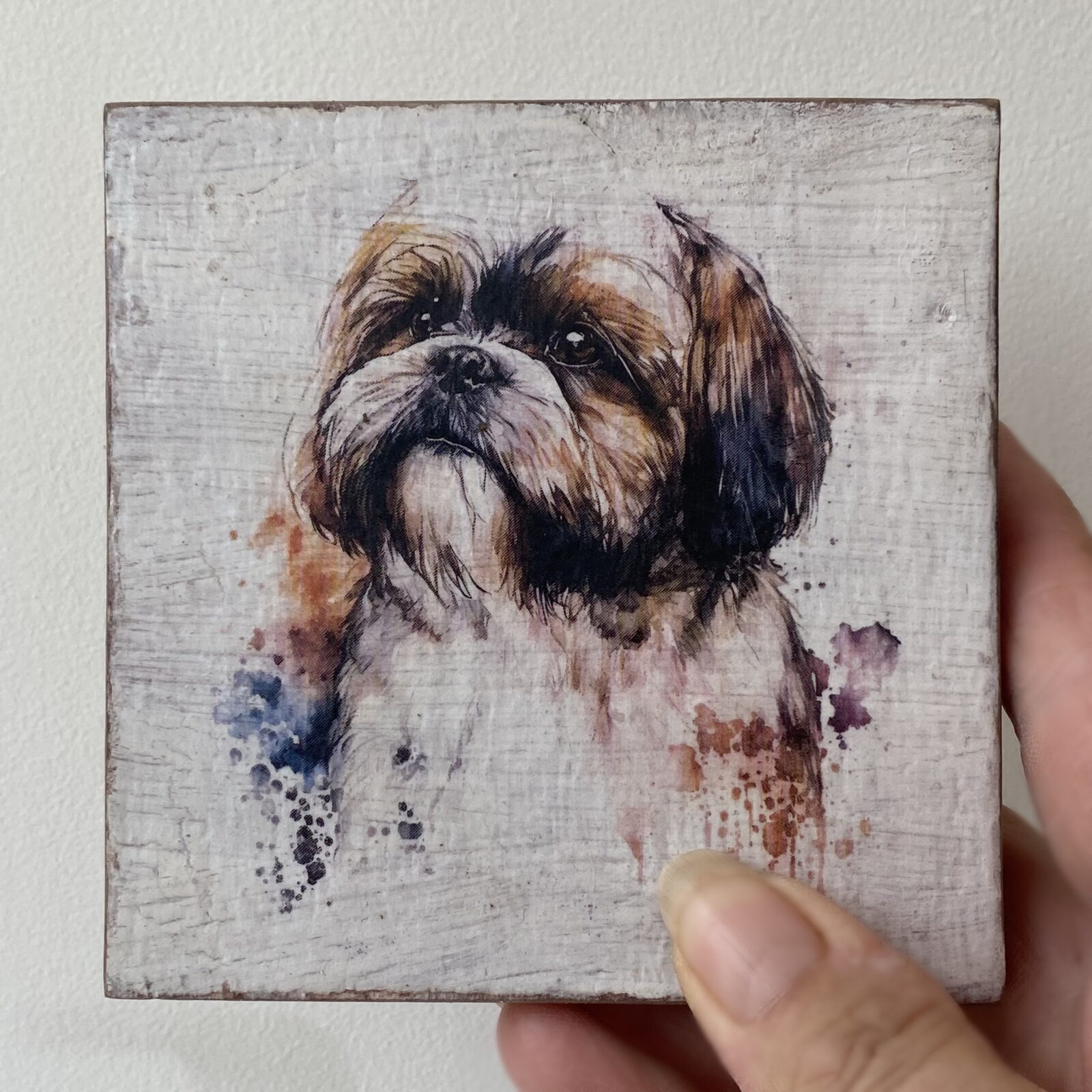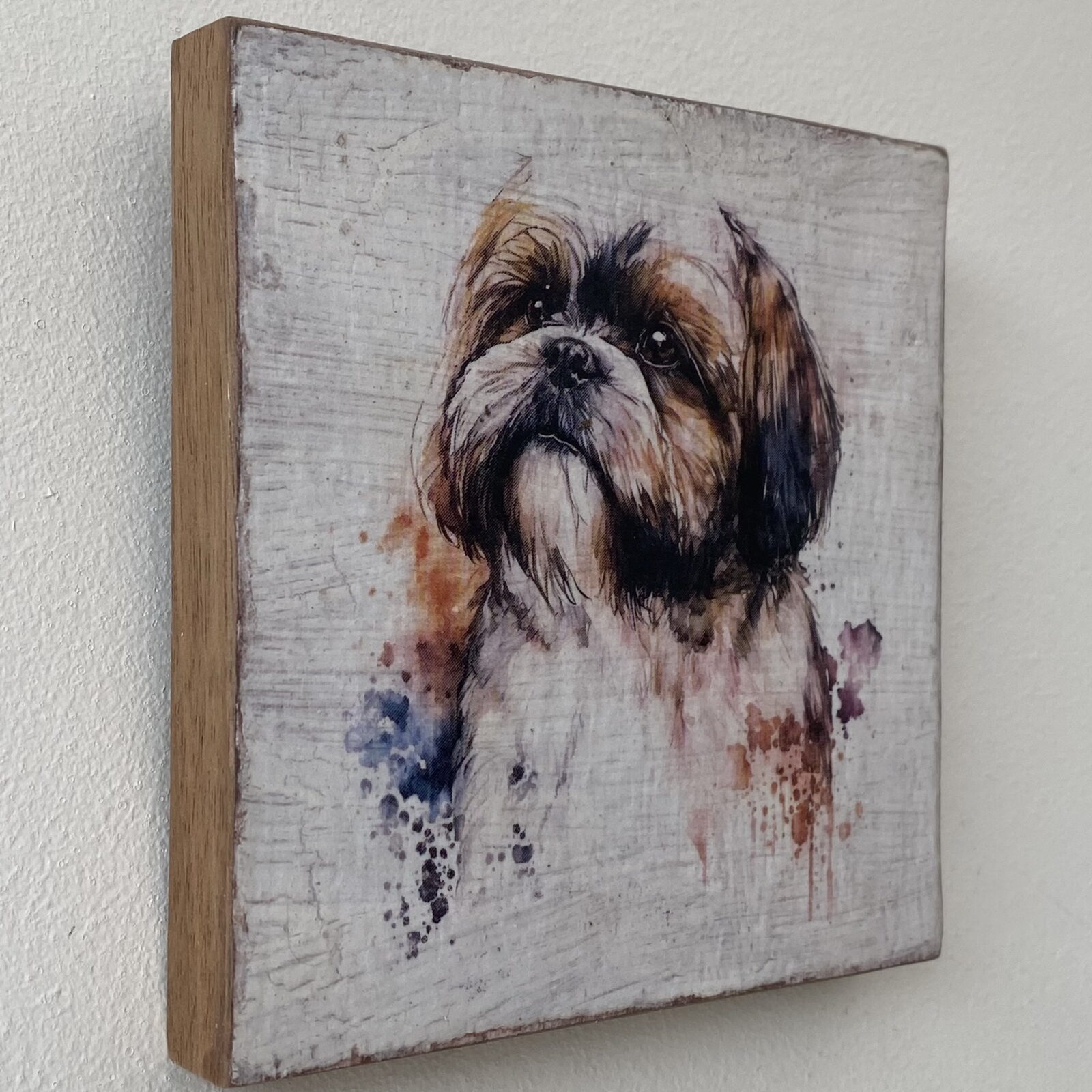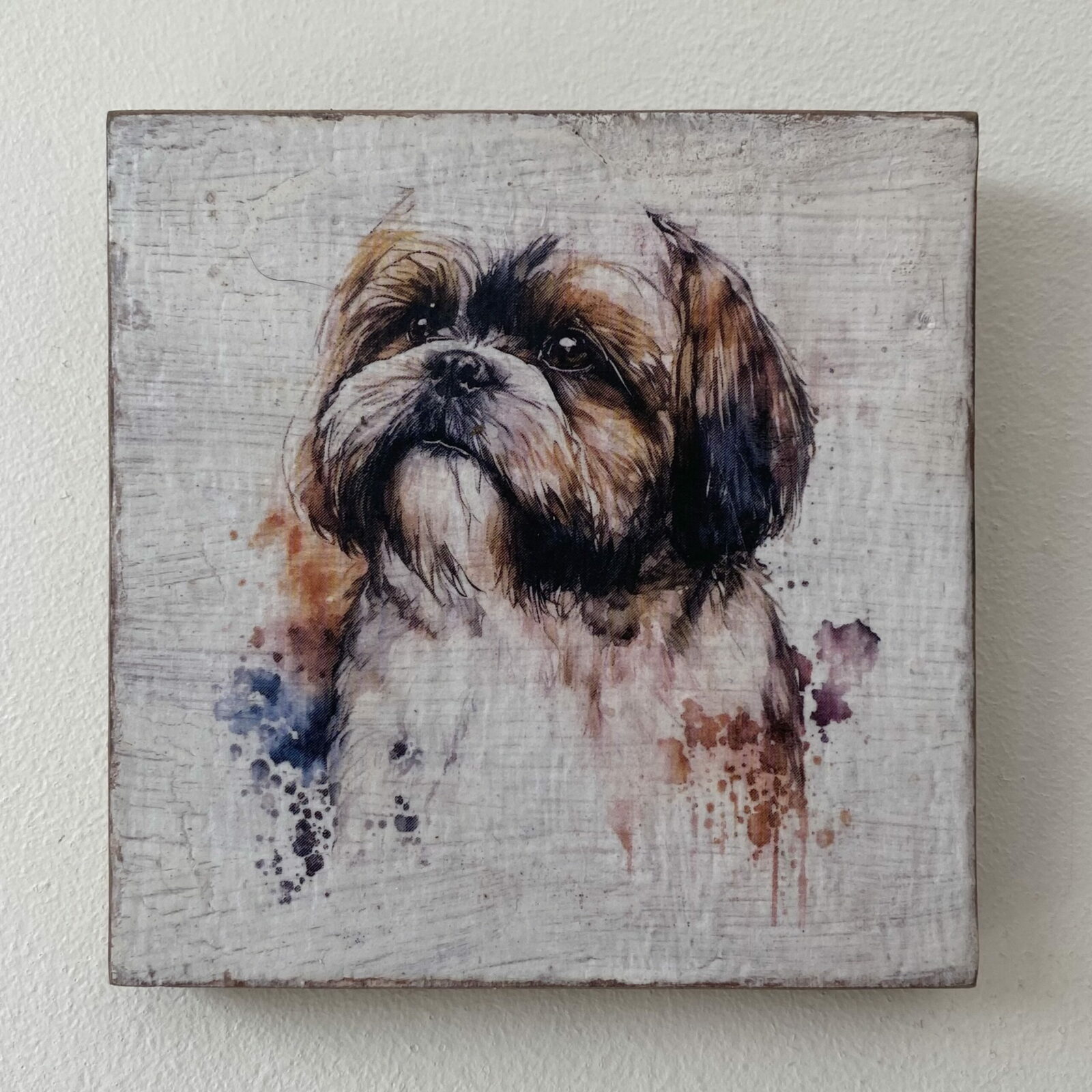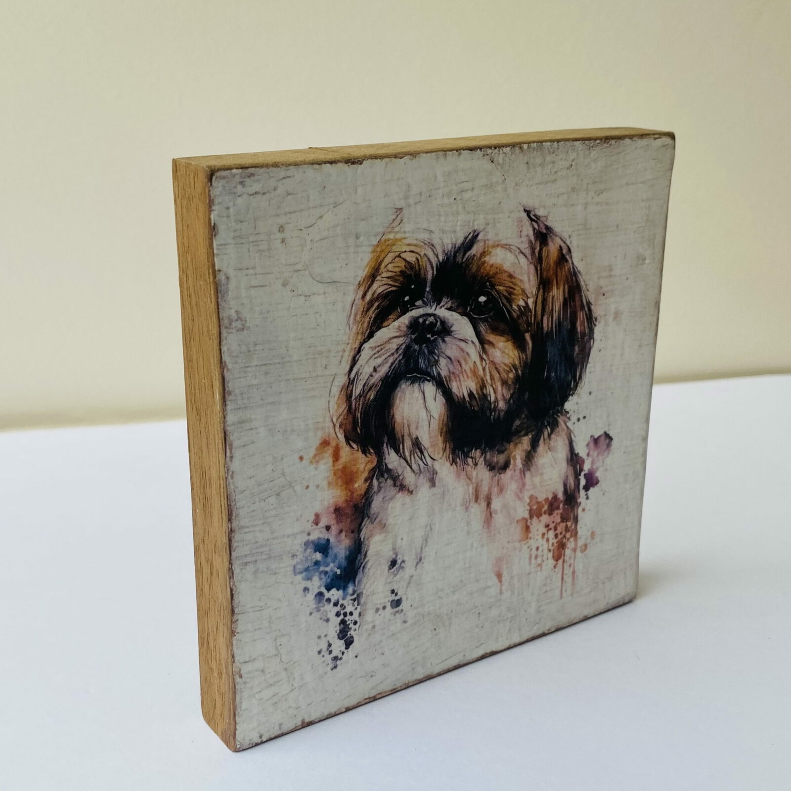 This is a beautiful hand made original design freestanding or hanging plaque. Made from recycled wood, the background has been painted and distressed, and the featured dog breed – a Shih Tzu, has a hand painted water colour appearance.