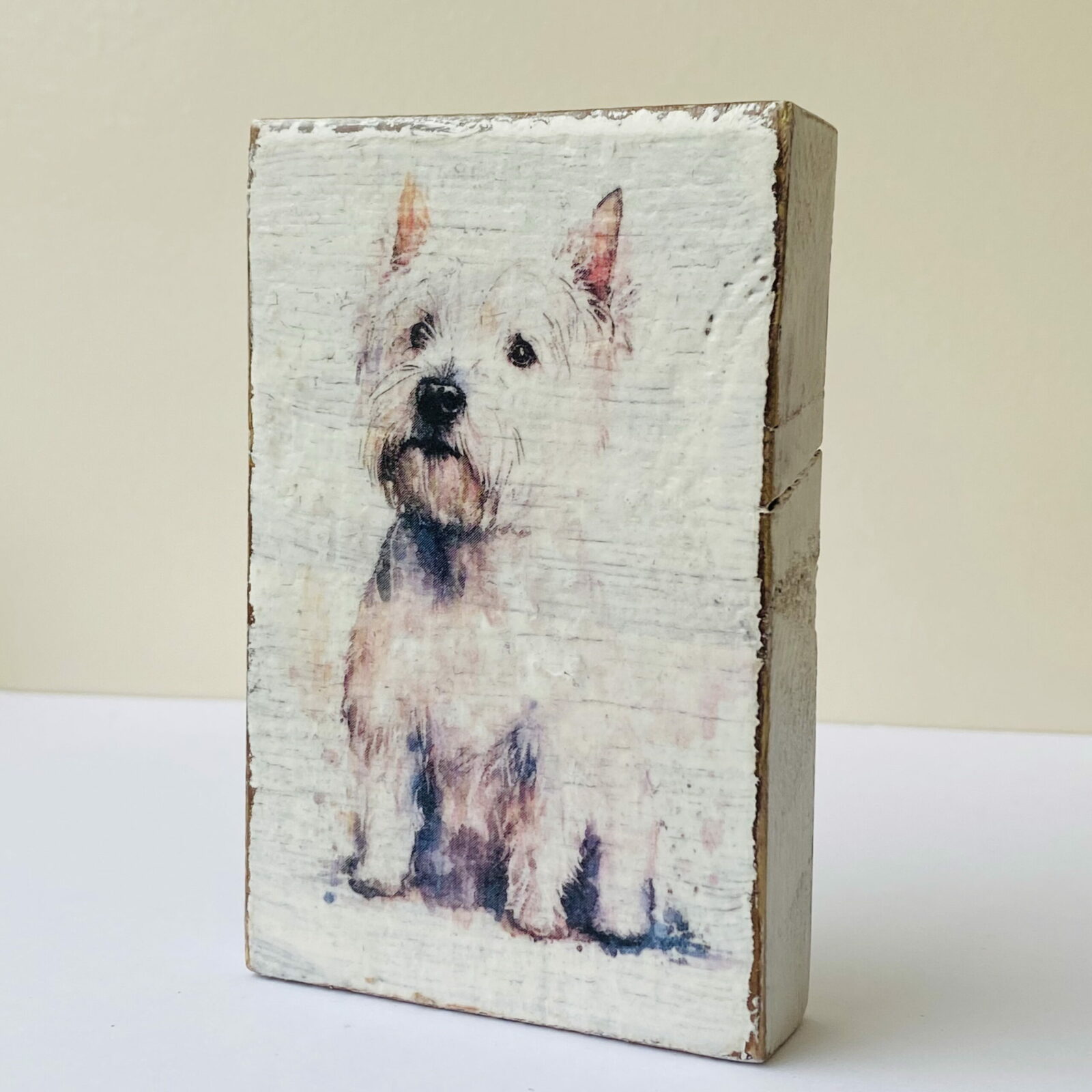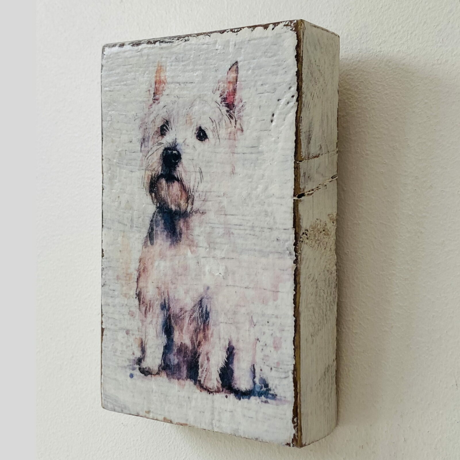 This is a beautiful hand made original design freestanding or hanging plaque. Made from recycled rough pine wood (sanded), the background has been painted and distressed, and the featured dog breed – a West Highland Terrier, has a hand painted water colour appearance.