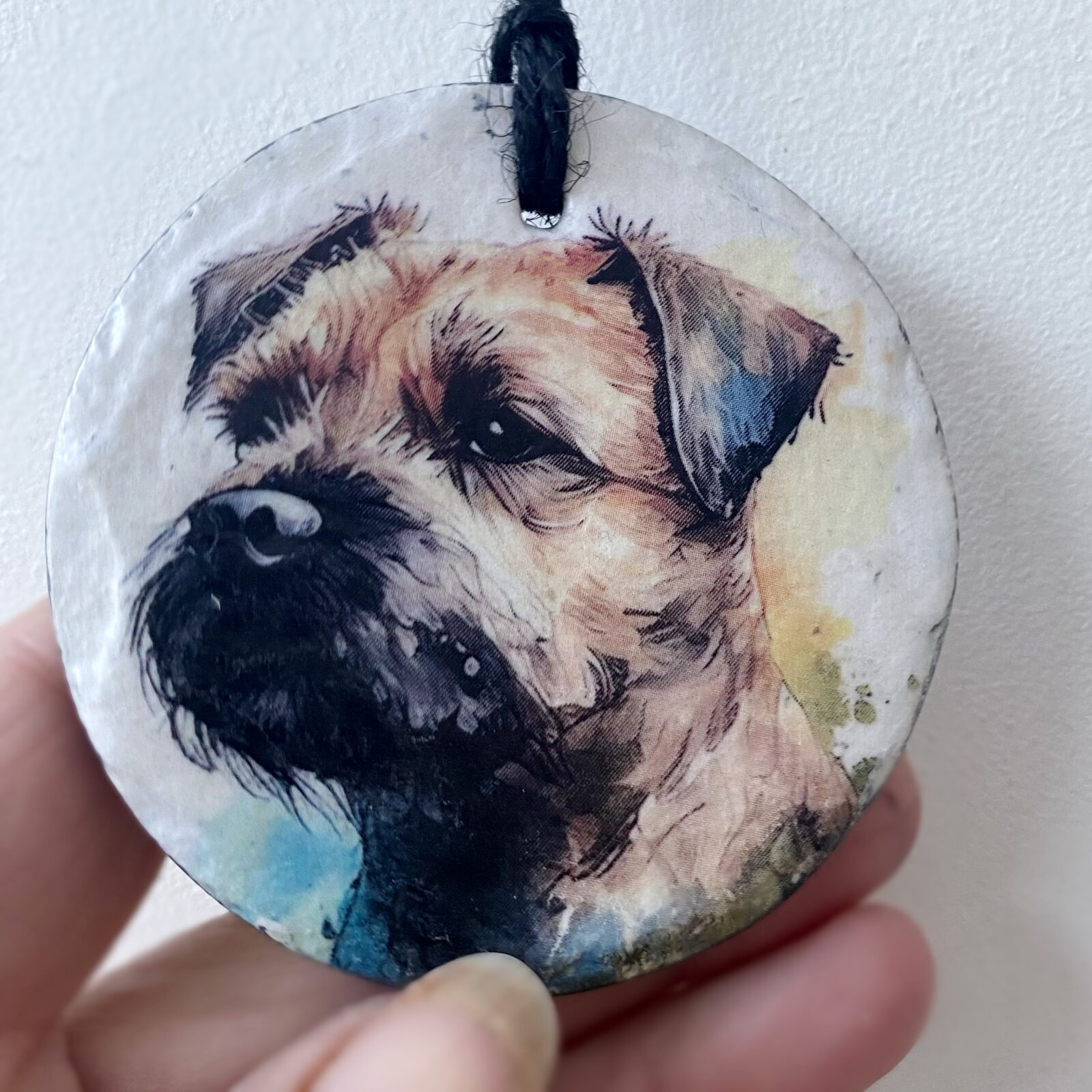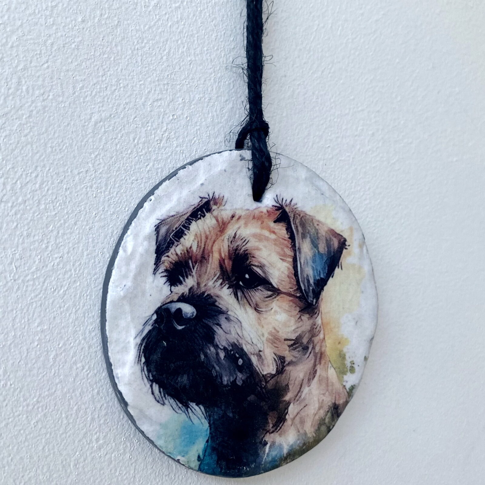 This is a beautiful slate circle, which has been painted with a pale cream chalk paint and decorated with a water colour paint effect Border Terrier.