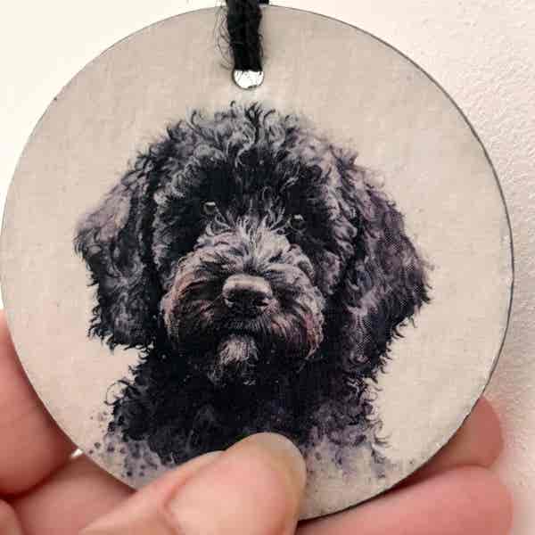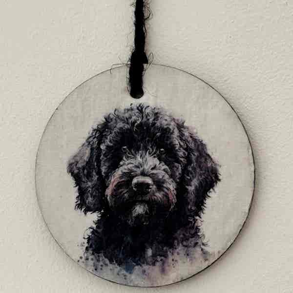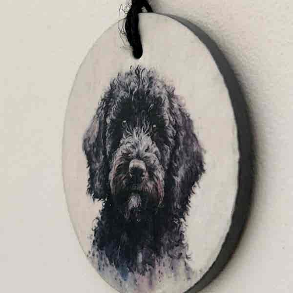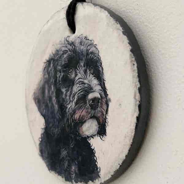 This is a beautiful slate circle, which has been painted with a pale cream chalk paint and decorated with a water colour paint effect black Cockapoo/Cavapoo. There are two designs to choose from
