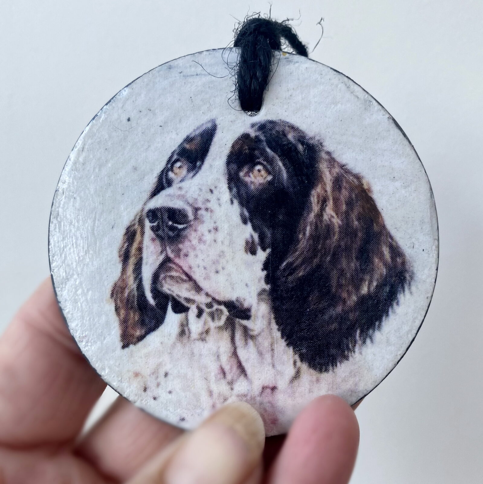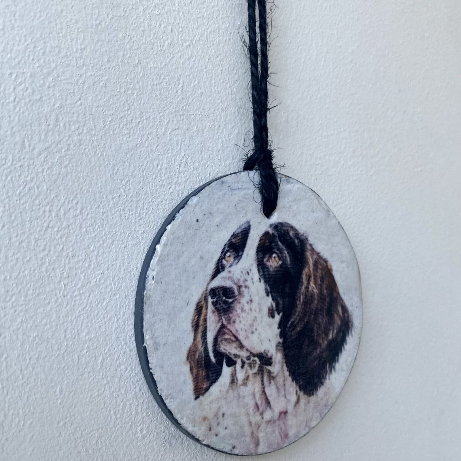 This is a beautiful slate circle, which has been painted with a pale cream chalk paint and decorated with a water colour paint effect Springer Spaniel.
