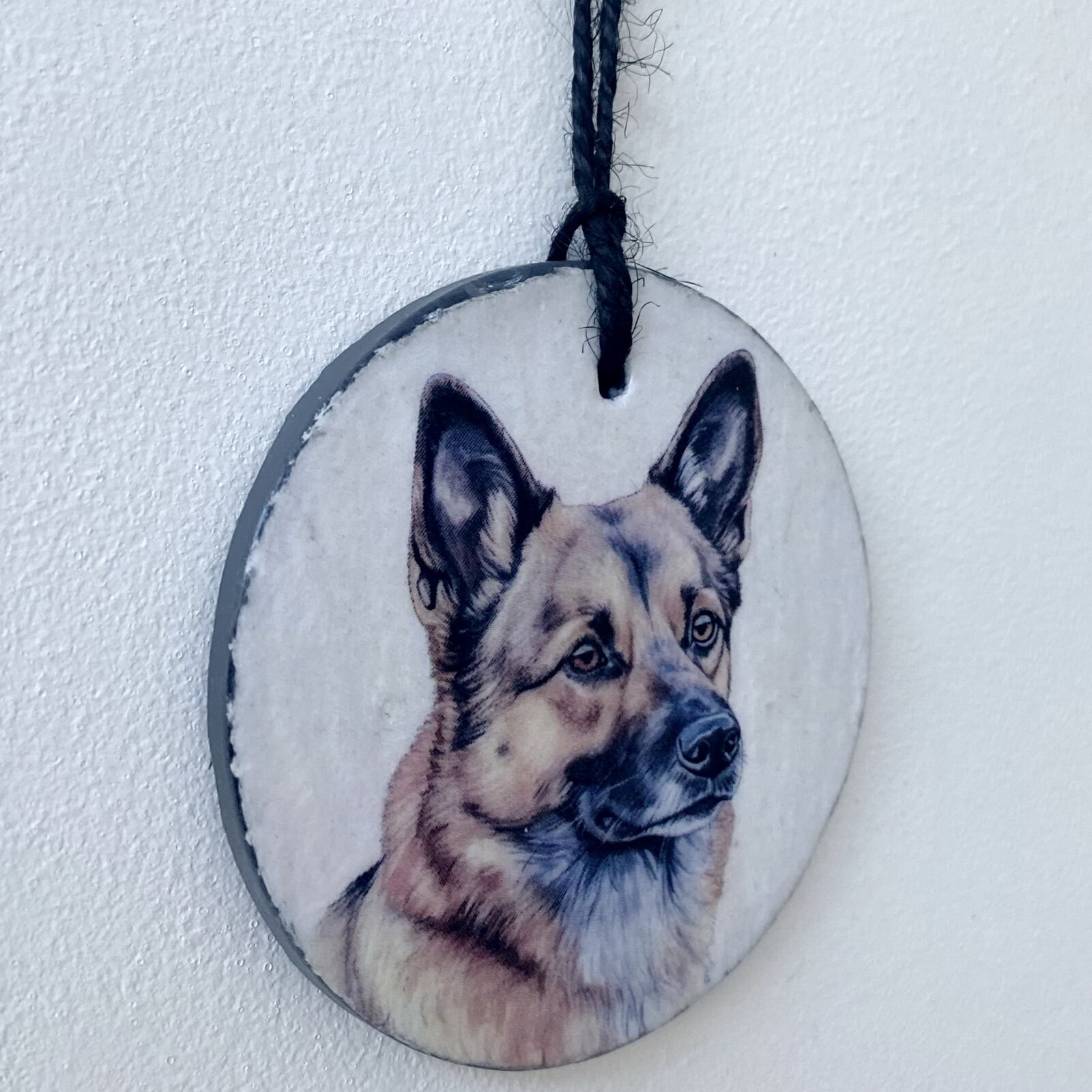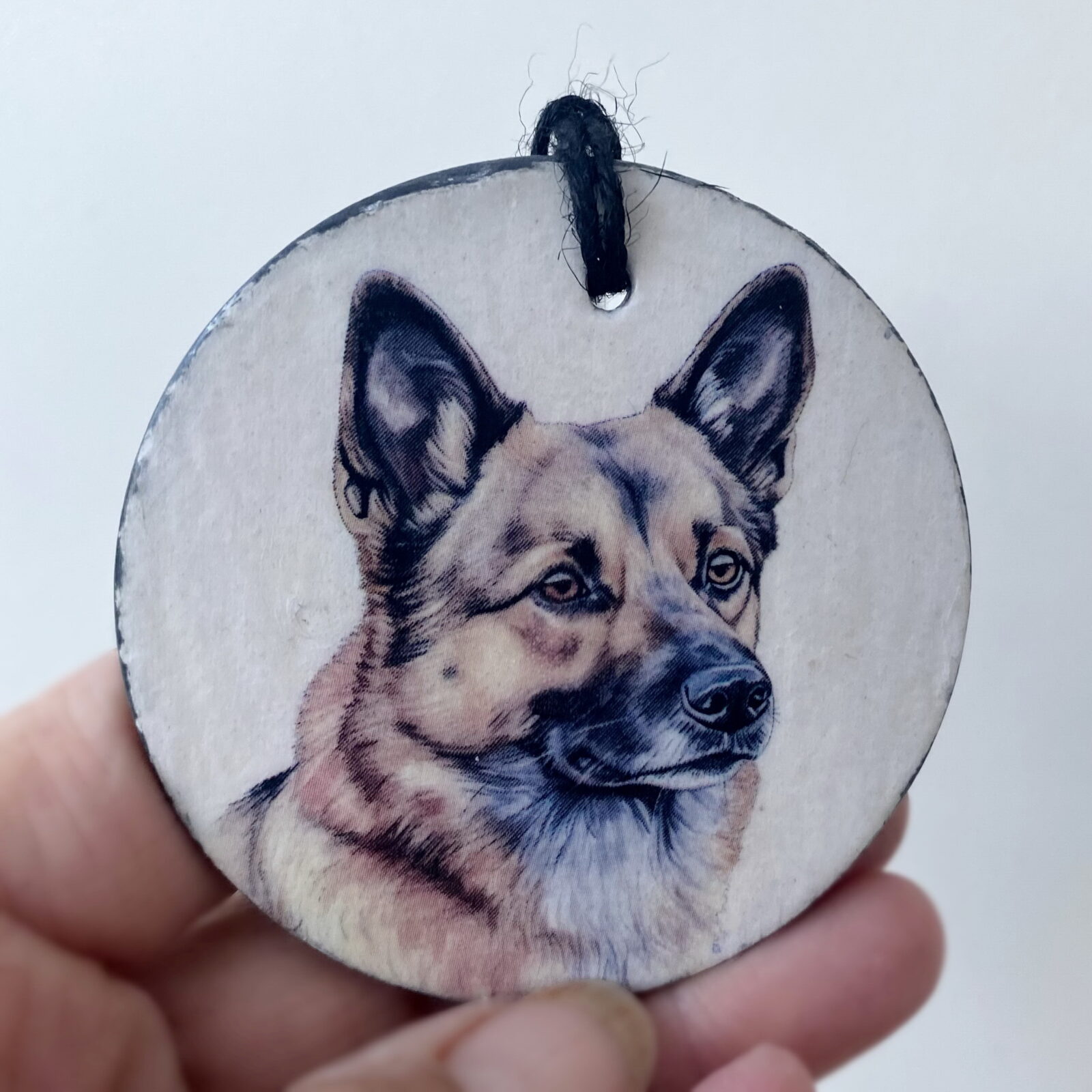 This is a beautiful slate circle, which has been painted with a pale cream chalk paint and decorated with a water colour paint effect Swedish Vallhund.