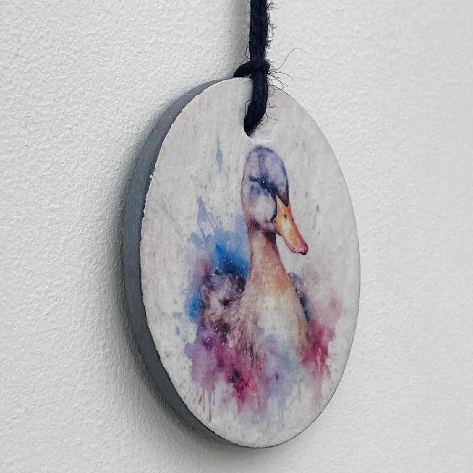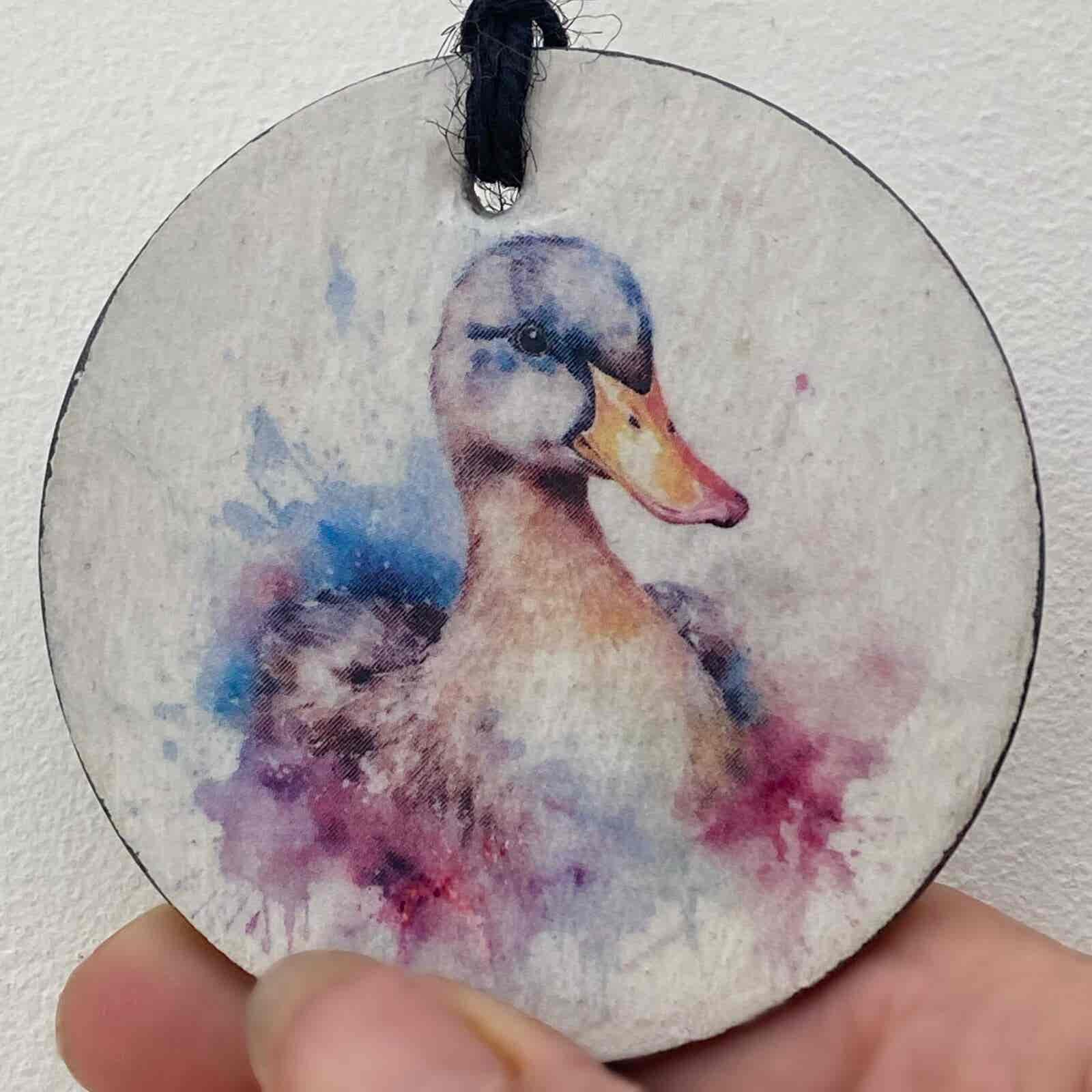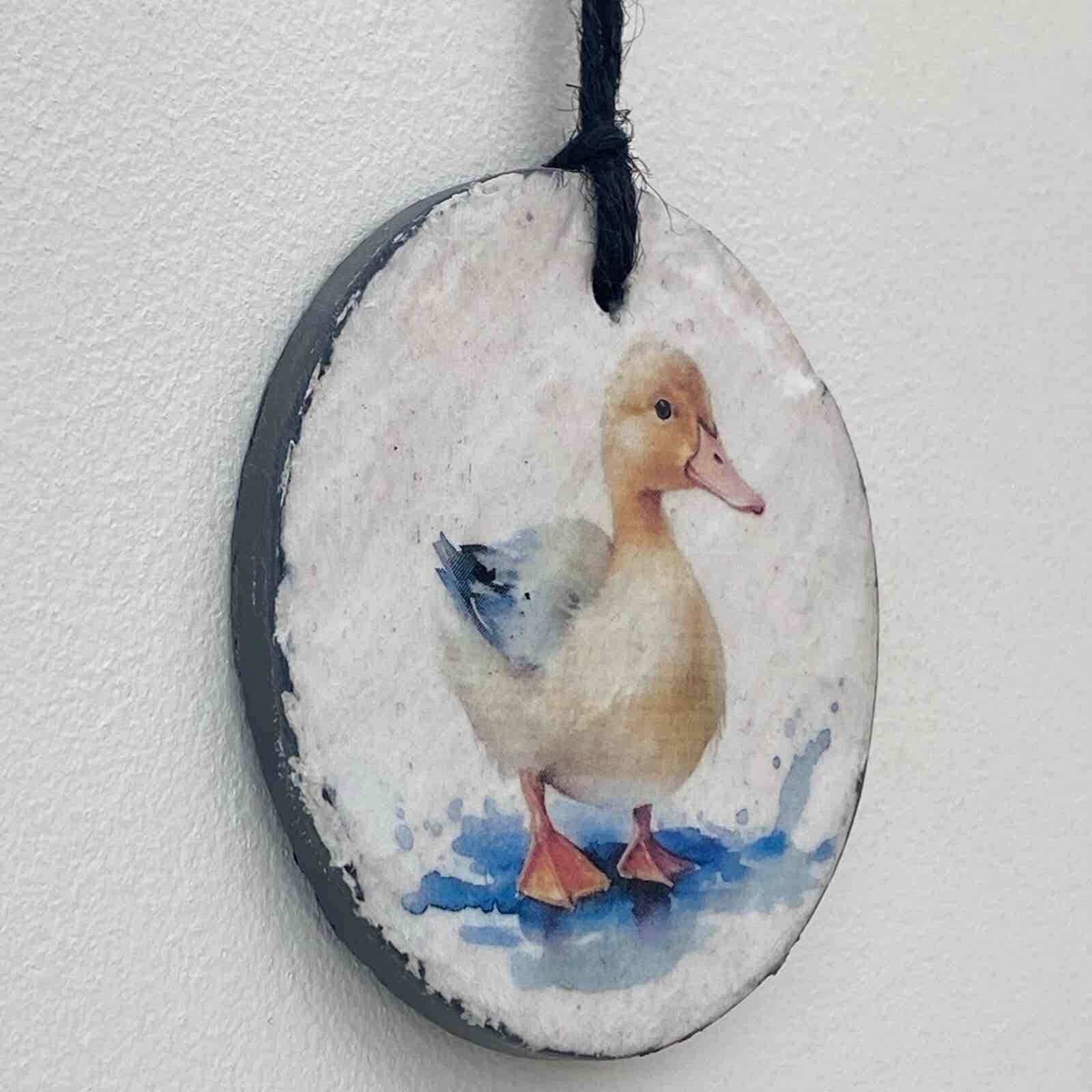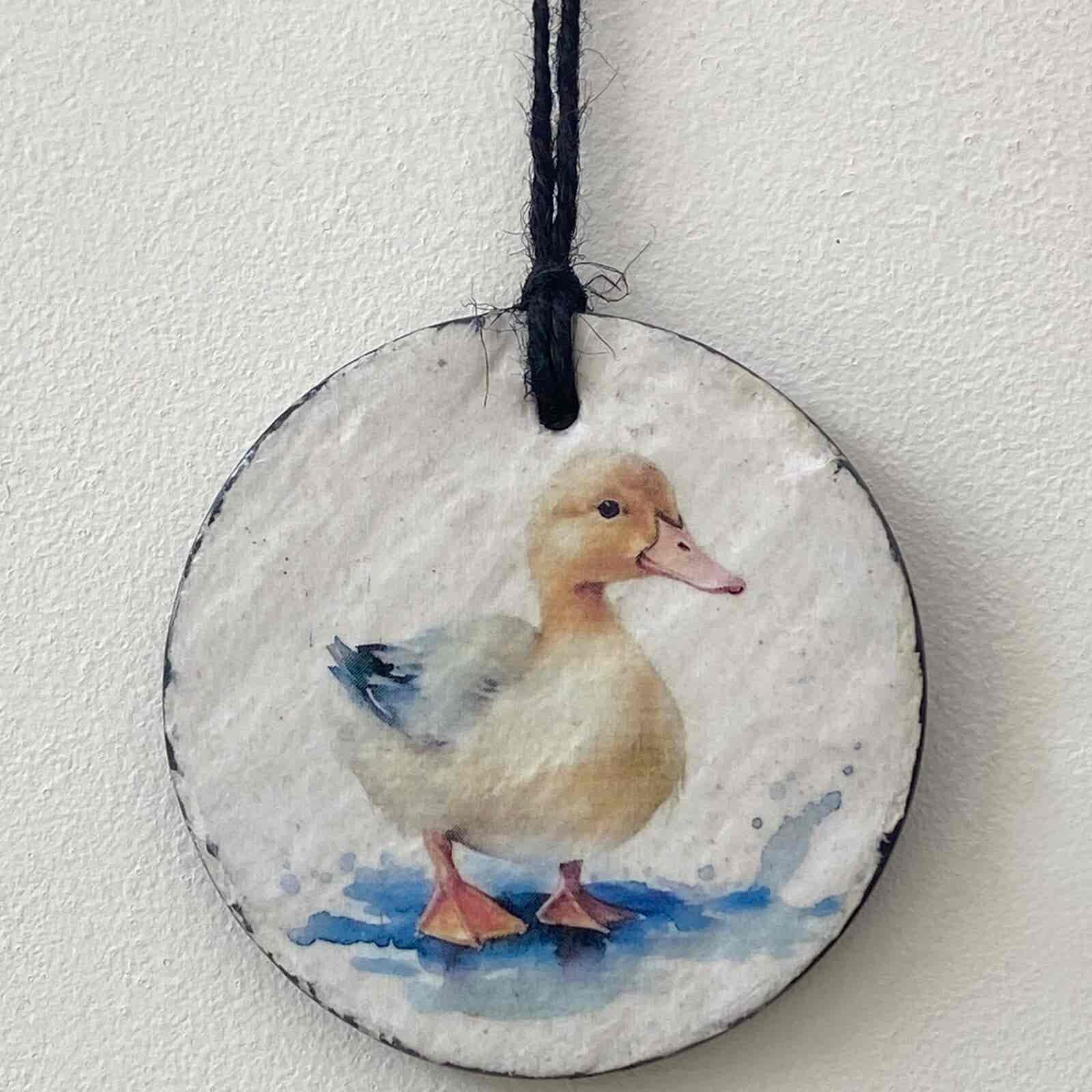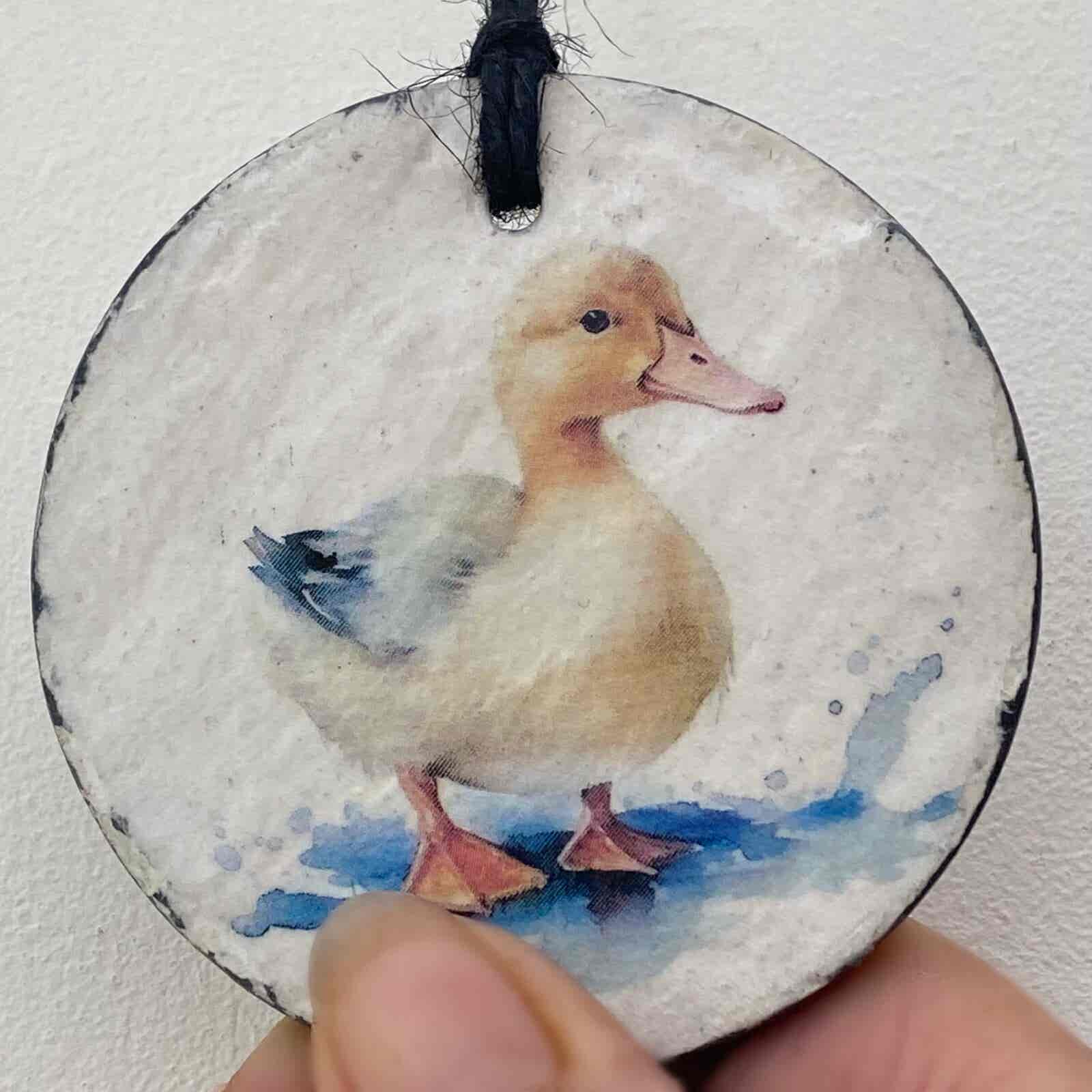 This is a beautiful slate circle, which has been painted with a pale cream chalk paint and decorated with a water colour paint effect cute duck (2 designs).
