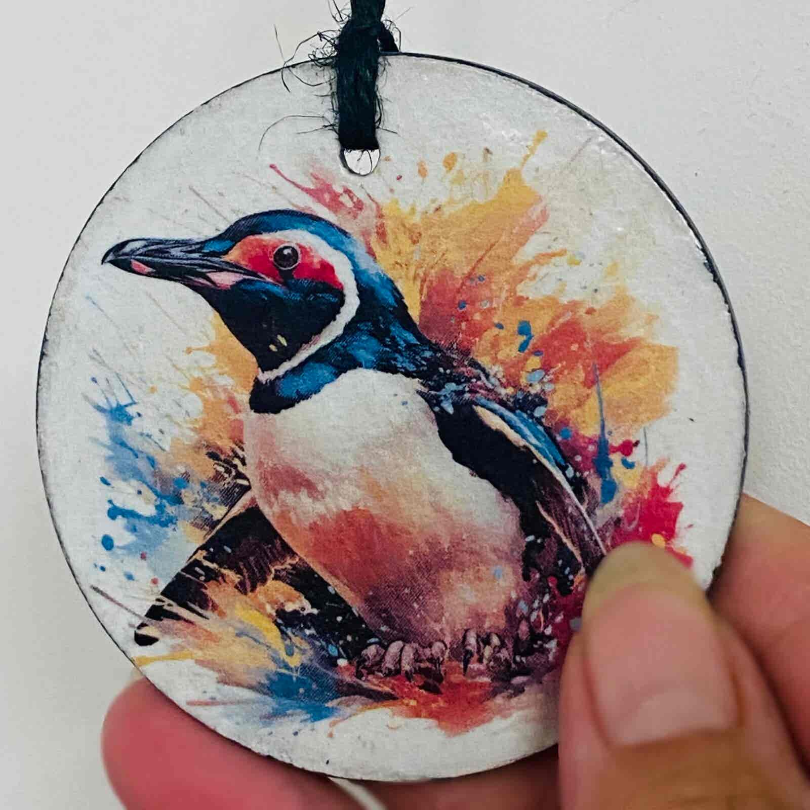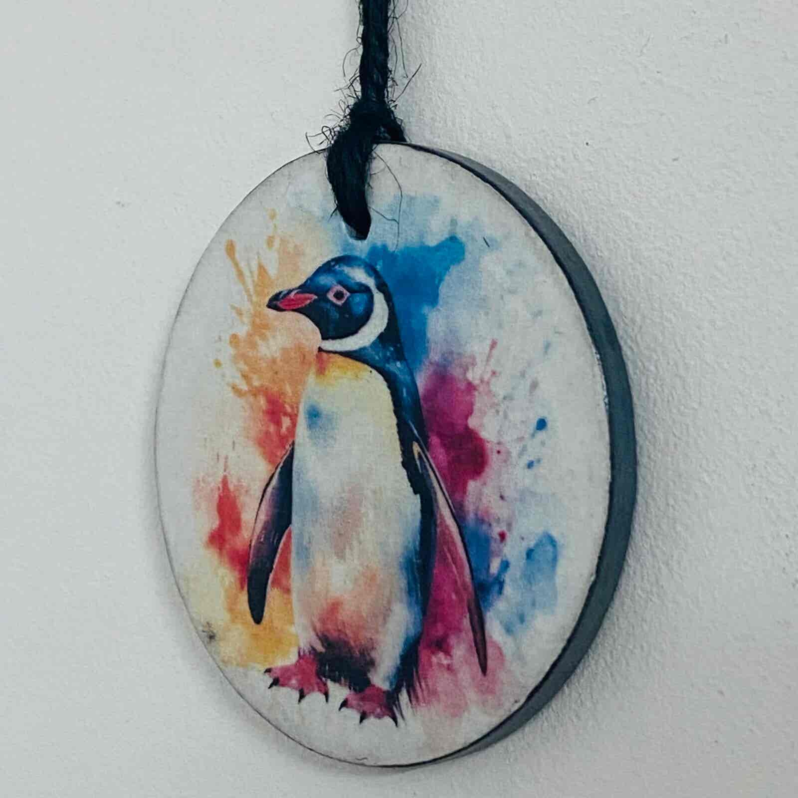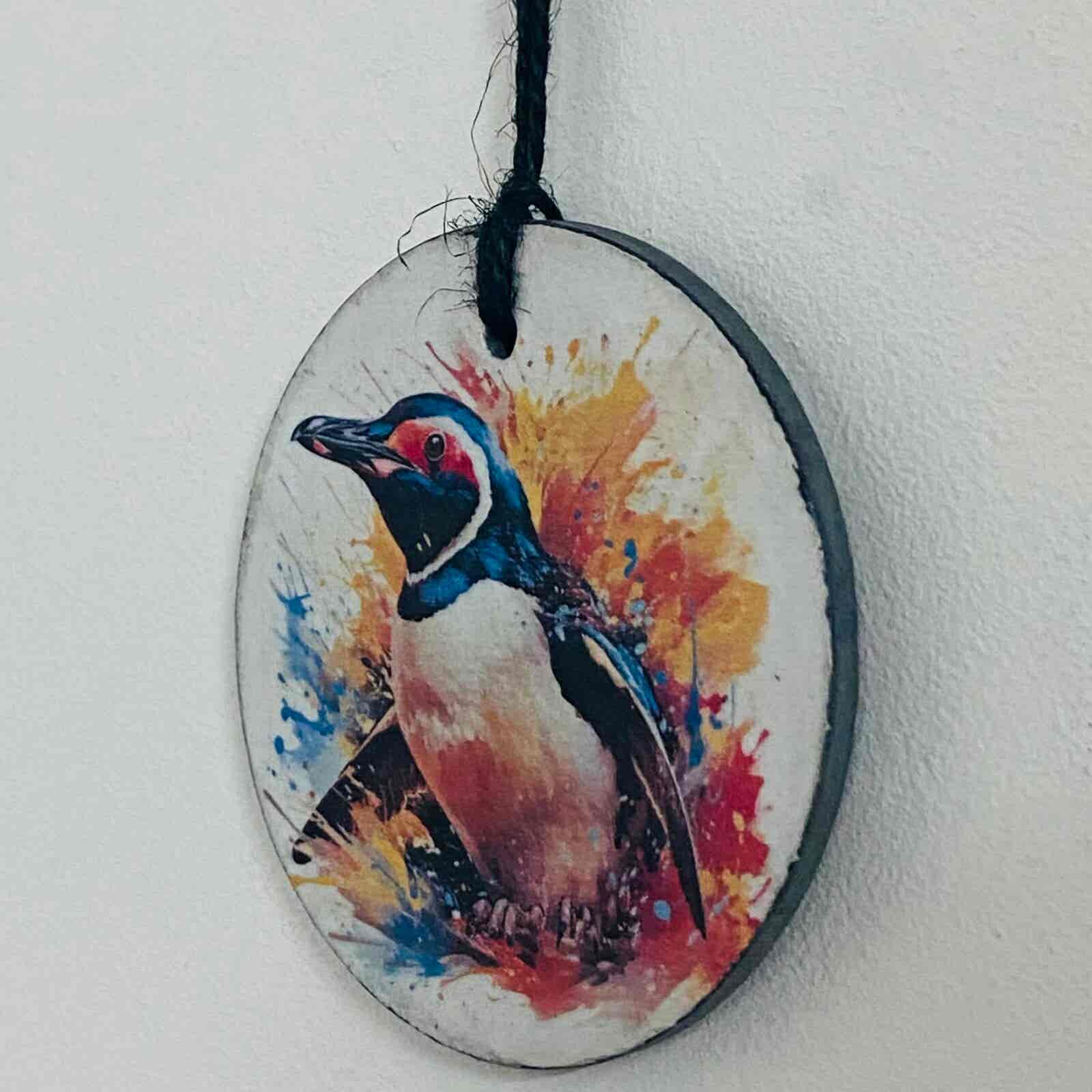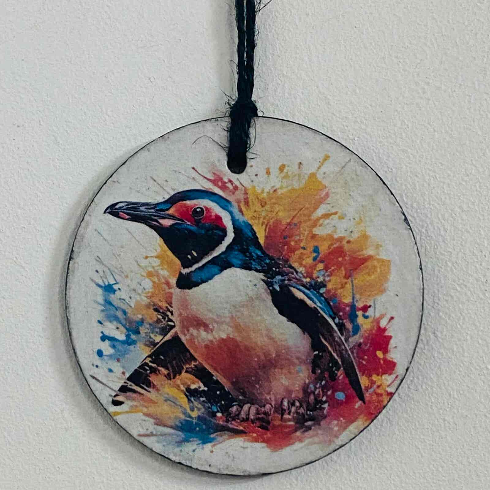 A beautiful hand painted slate circle, water colour paint effect penguin, with a choice of 2 designs.