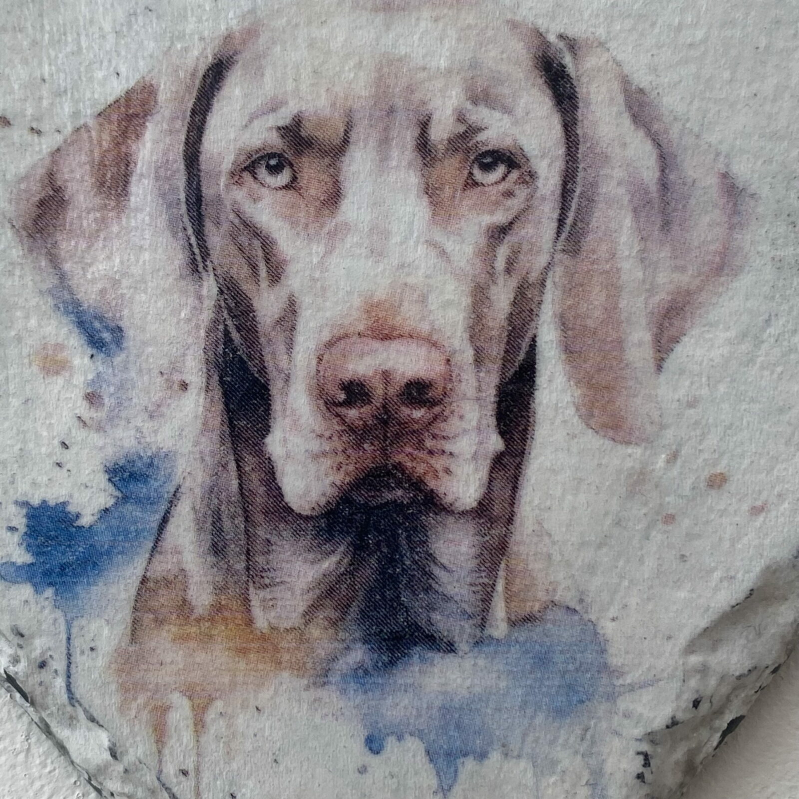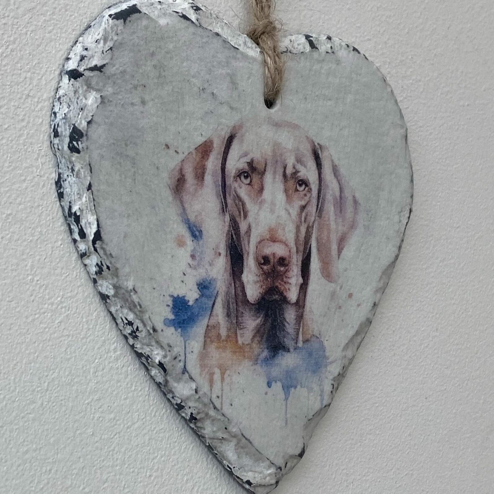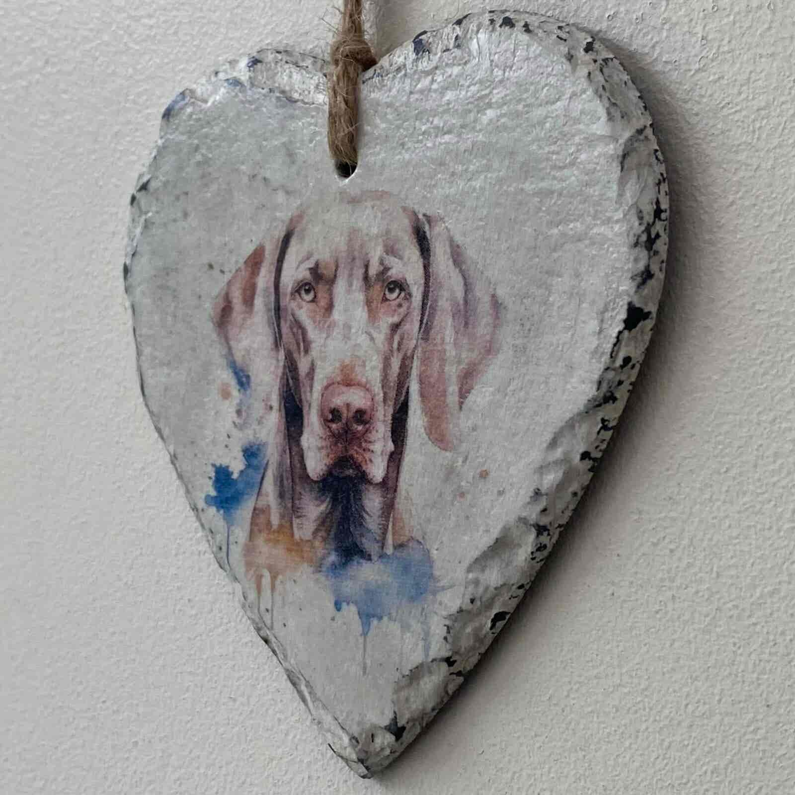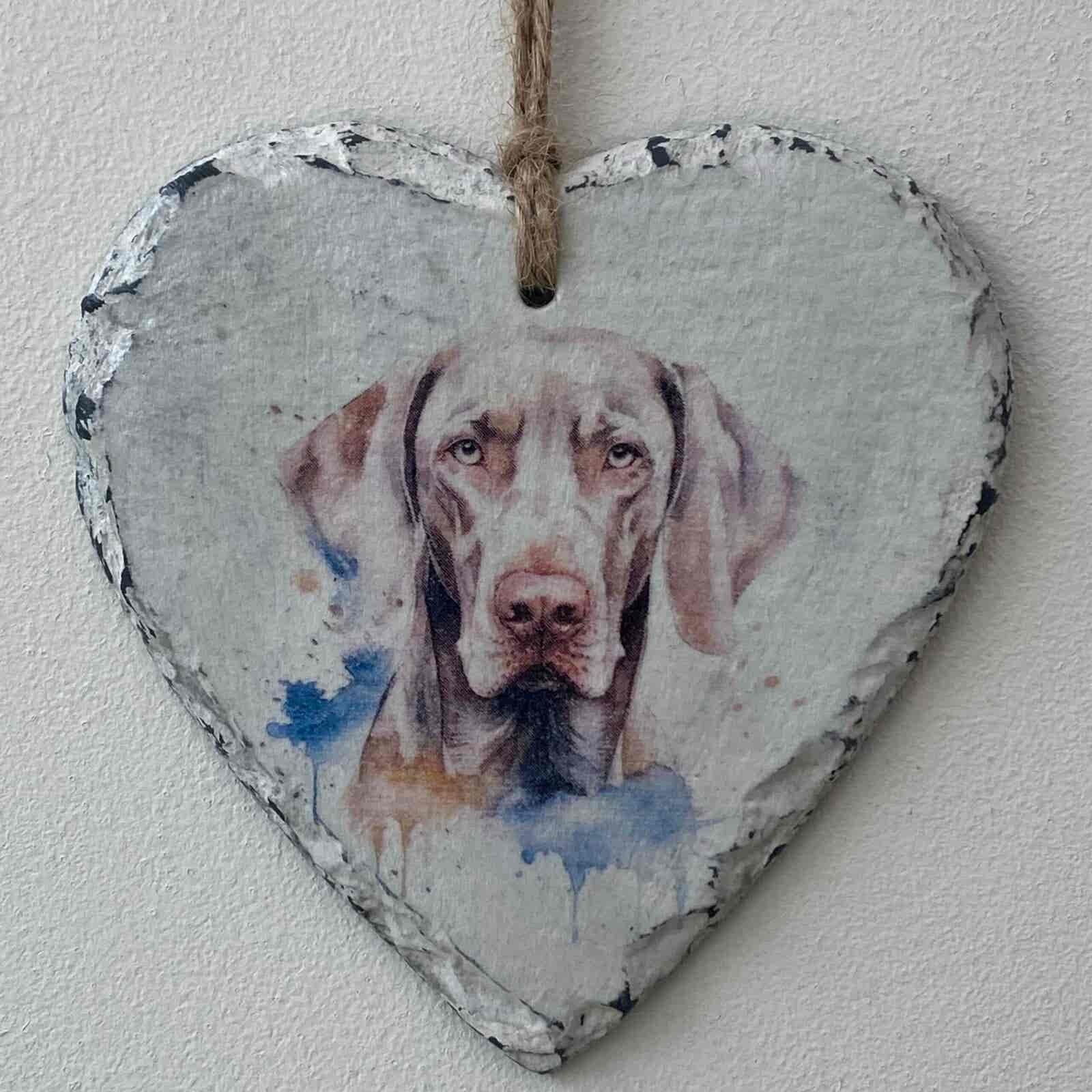 This is a beautiful slate heart, which has been painted with a pale cream chalk paint and decorated with a water colour paint effect Weimaraner.