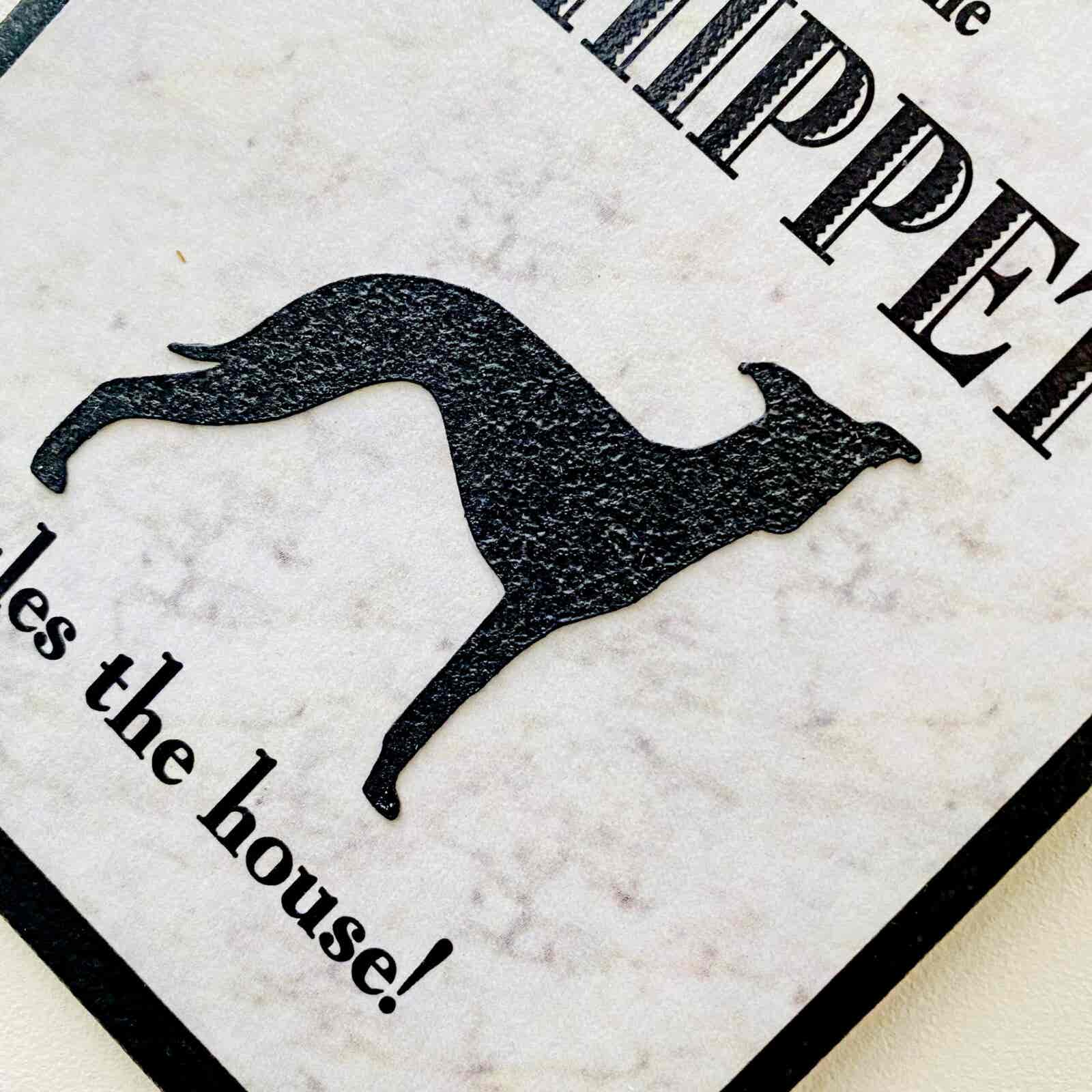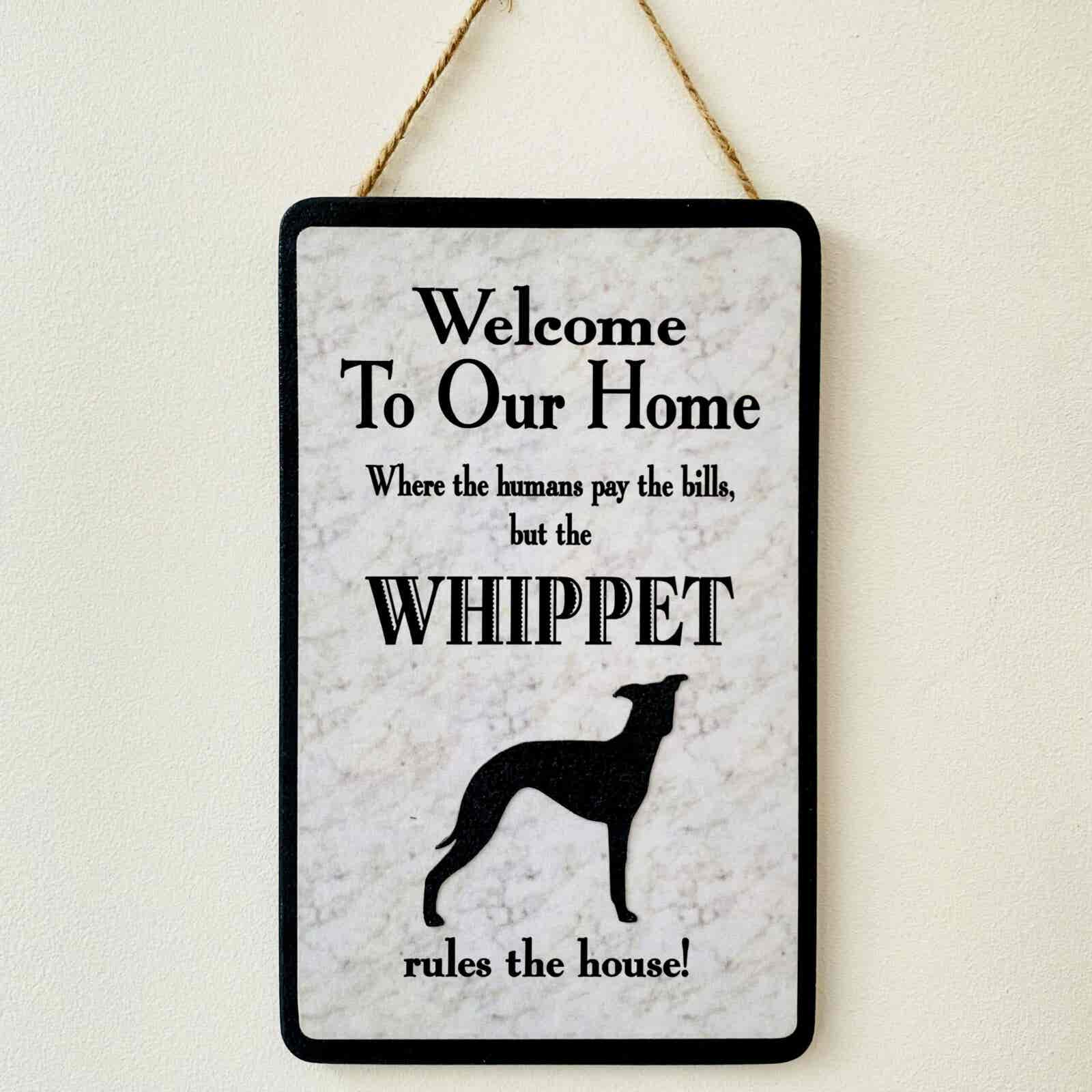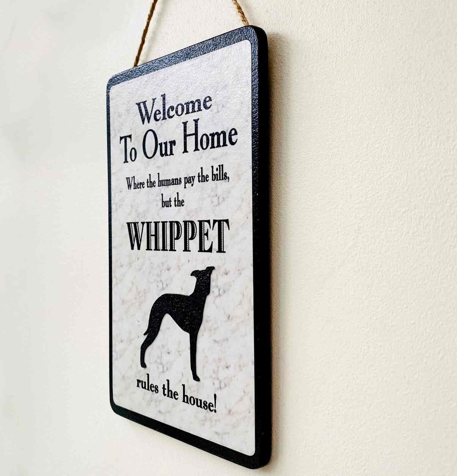 An original design, handmade “Welcome to Our Home” plaque, featuring the Whippet.