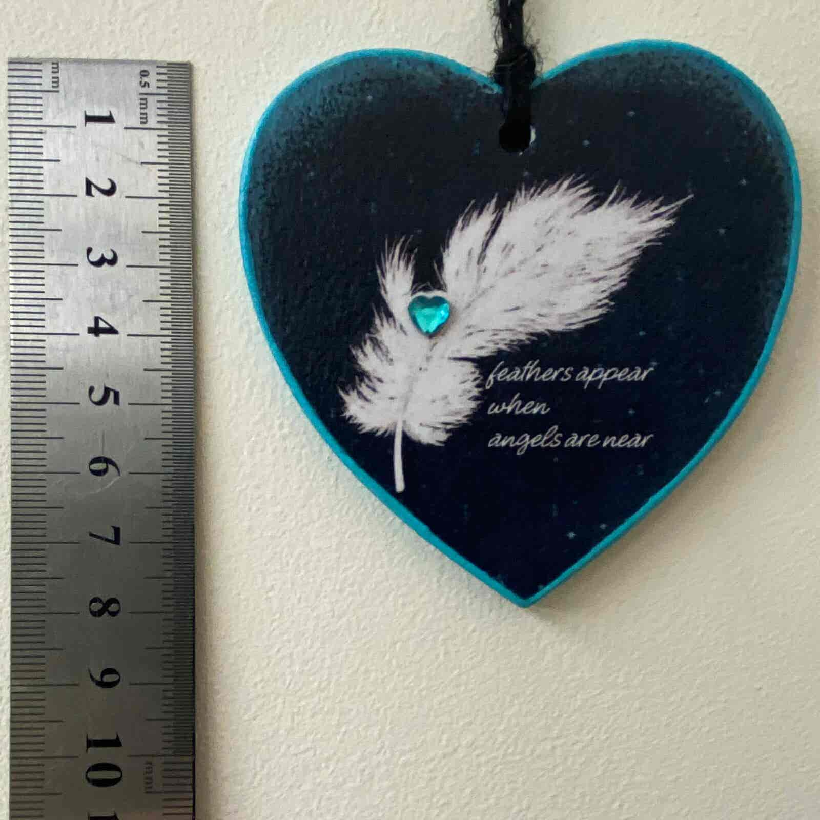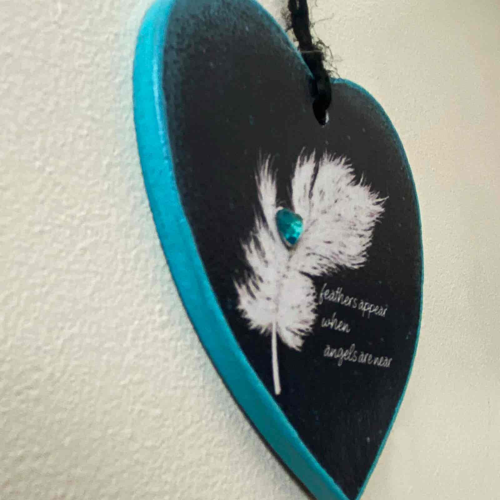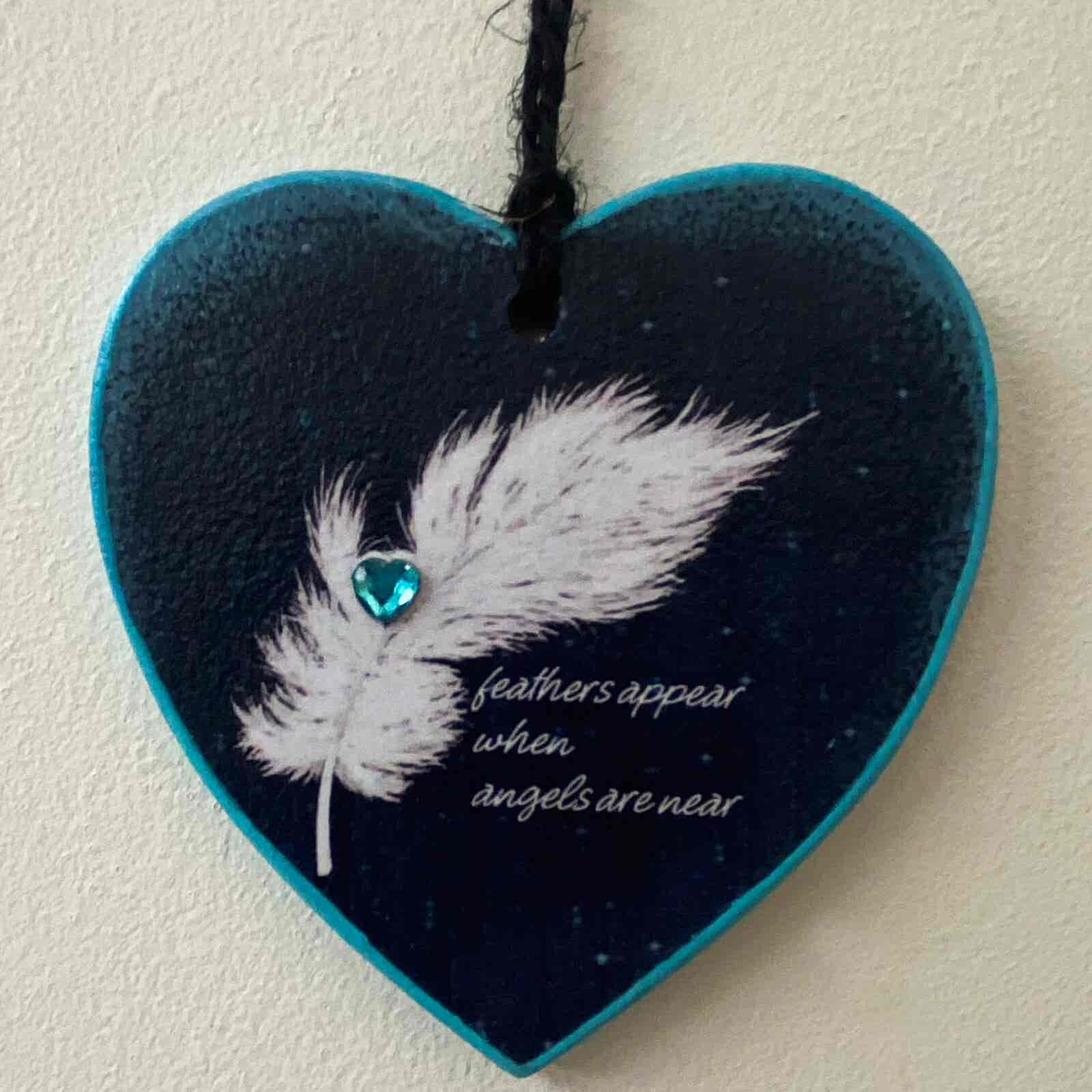 An original hanging heart memorial plaque, featuring a white feather with a turquoise gemstone.