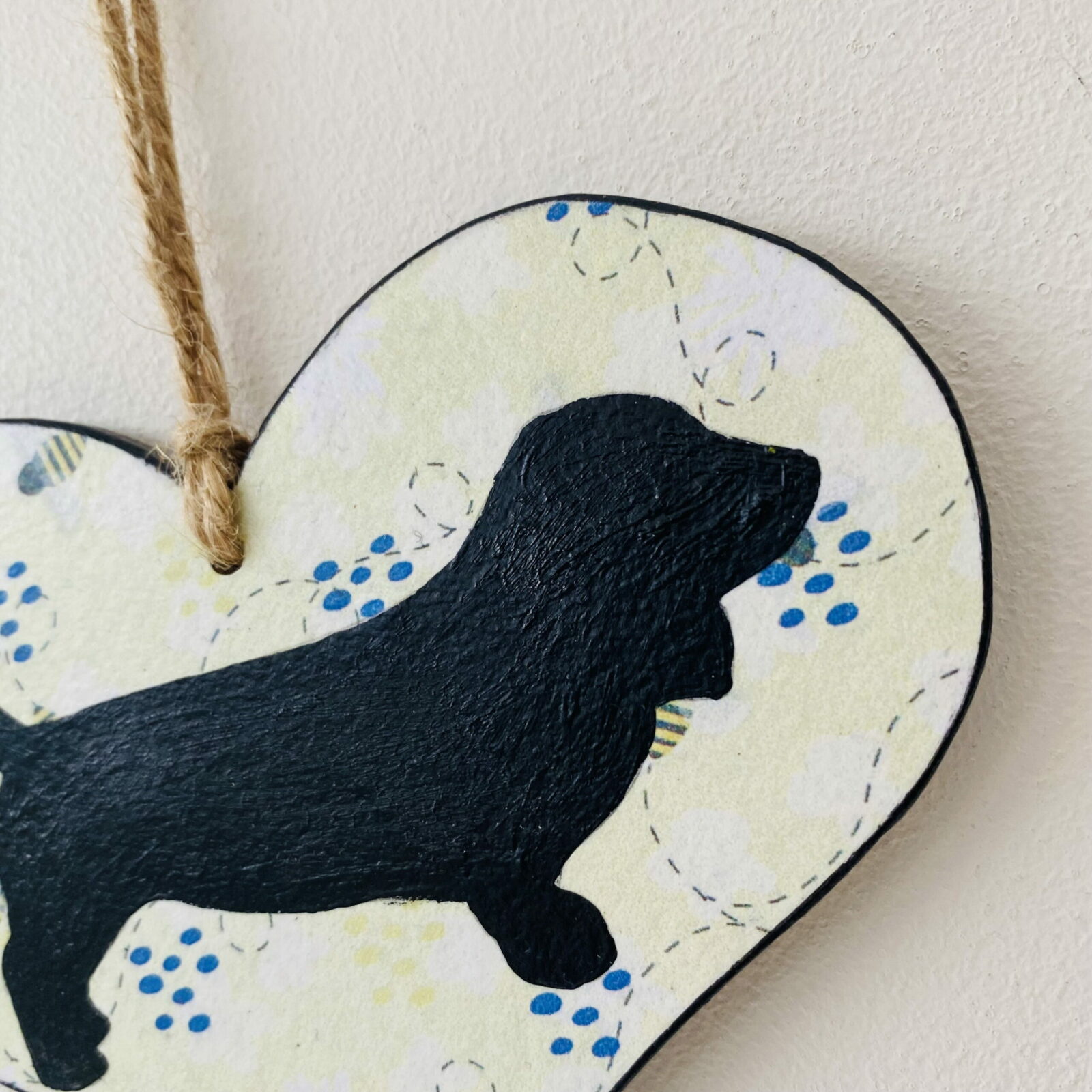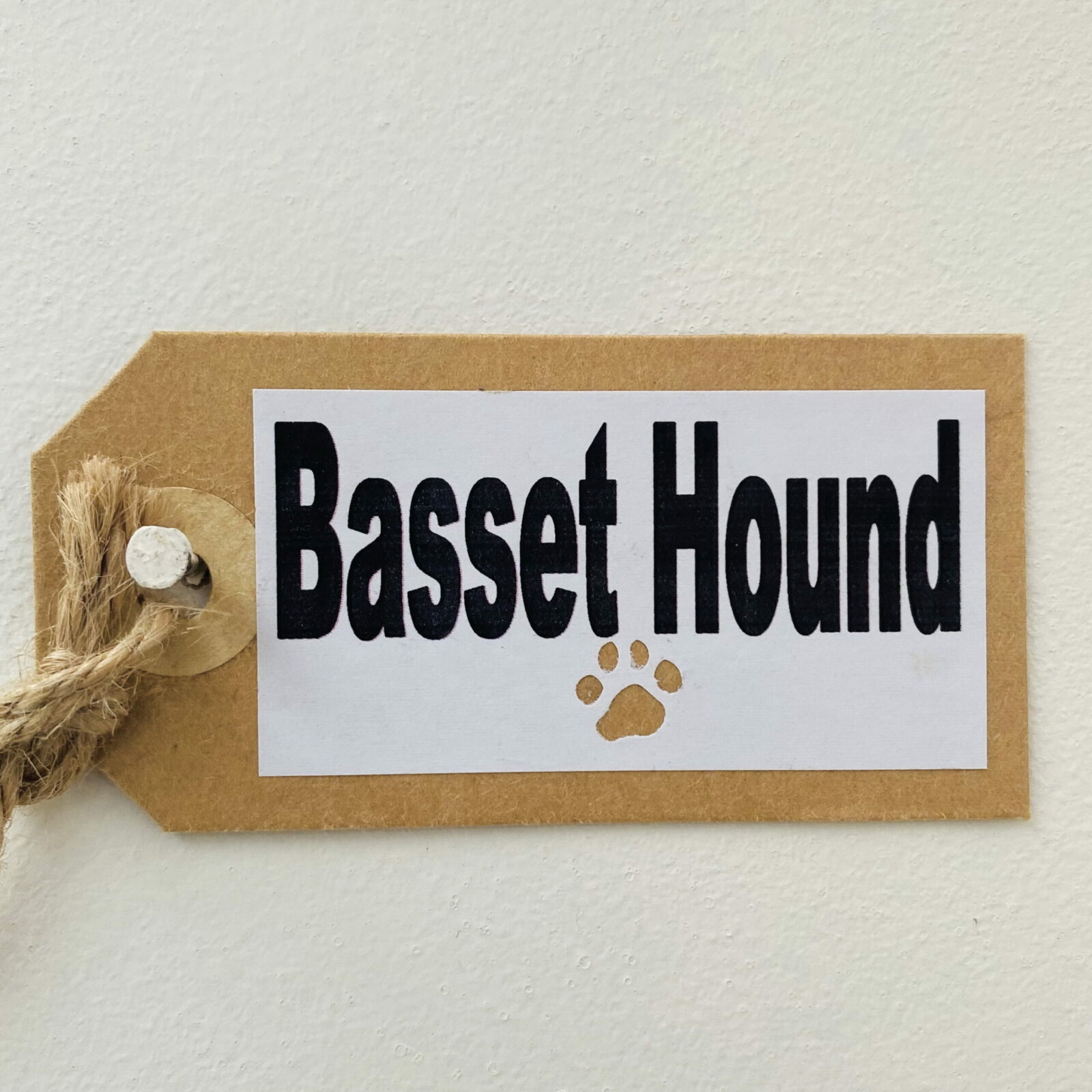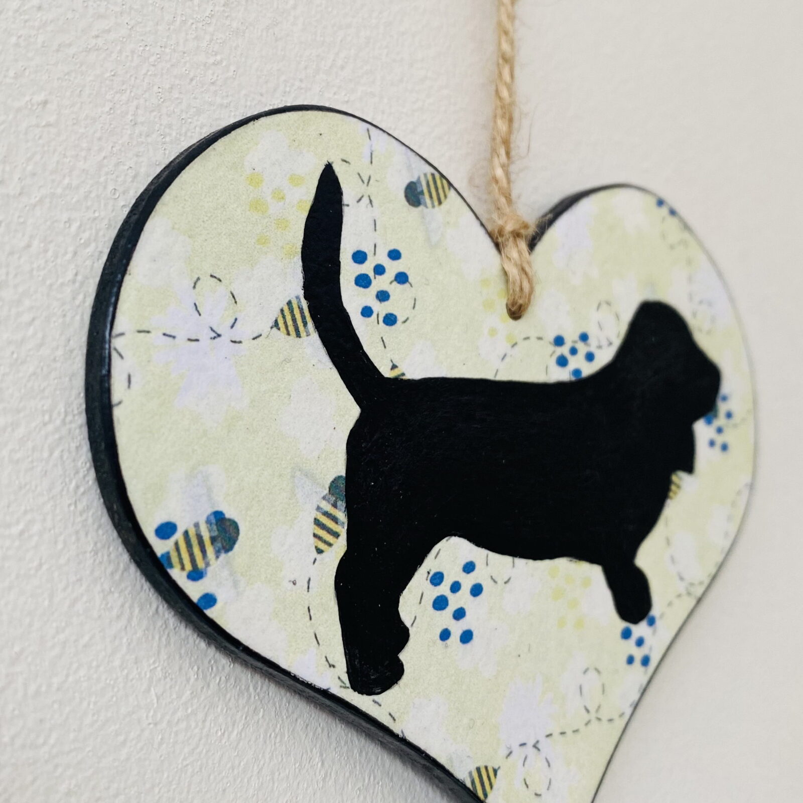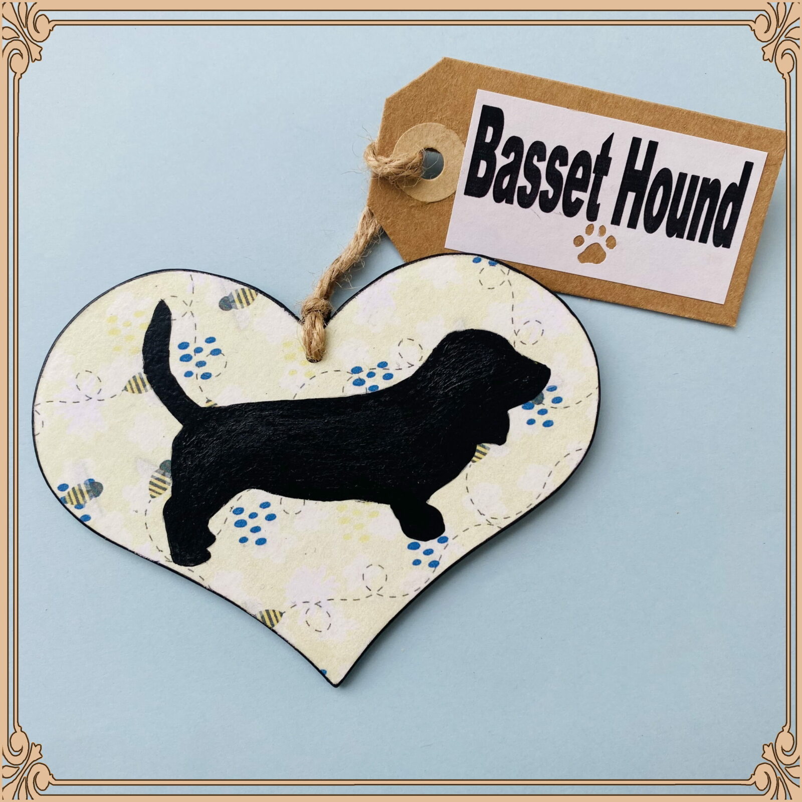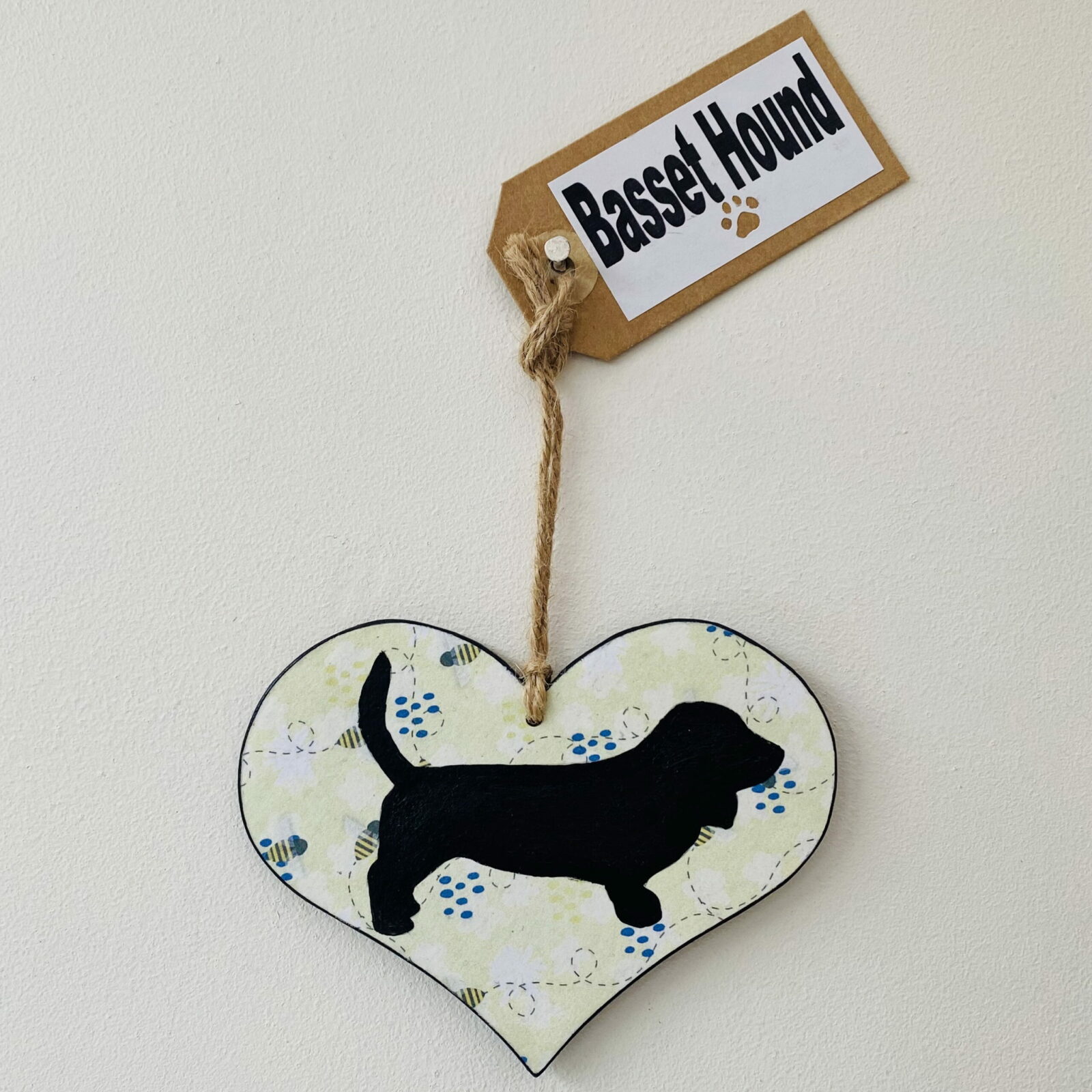 Beautifully finished, with an acrylic painted Basset Hound on a buzzing bee background. A hand made Kraft card tag, detailing the dog breed compliments the design.