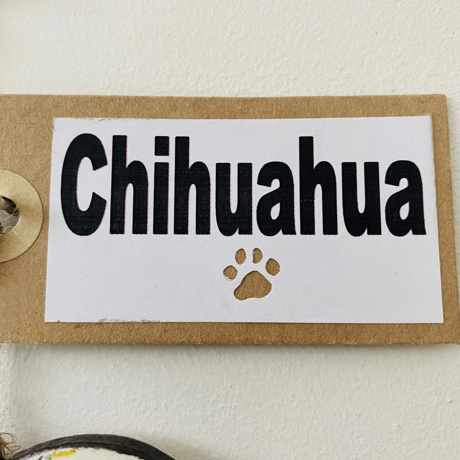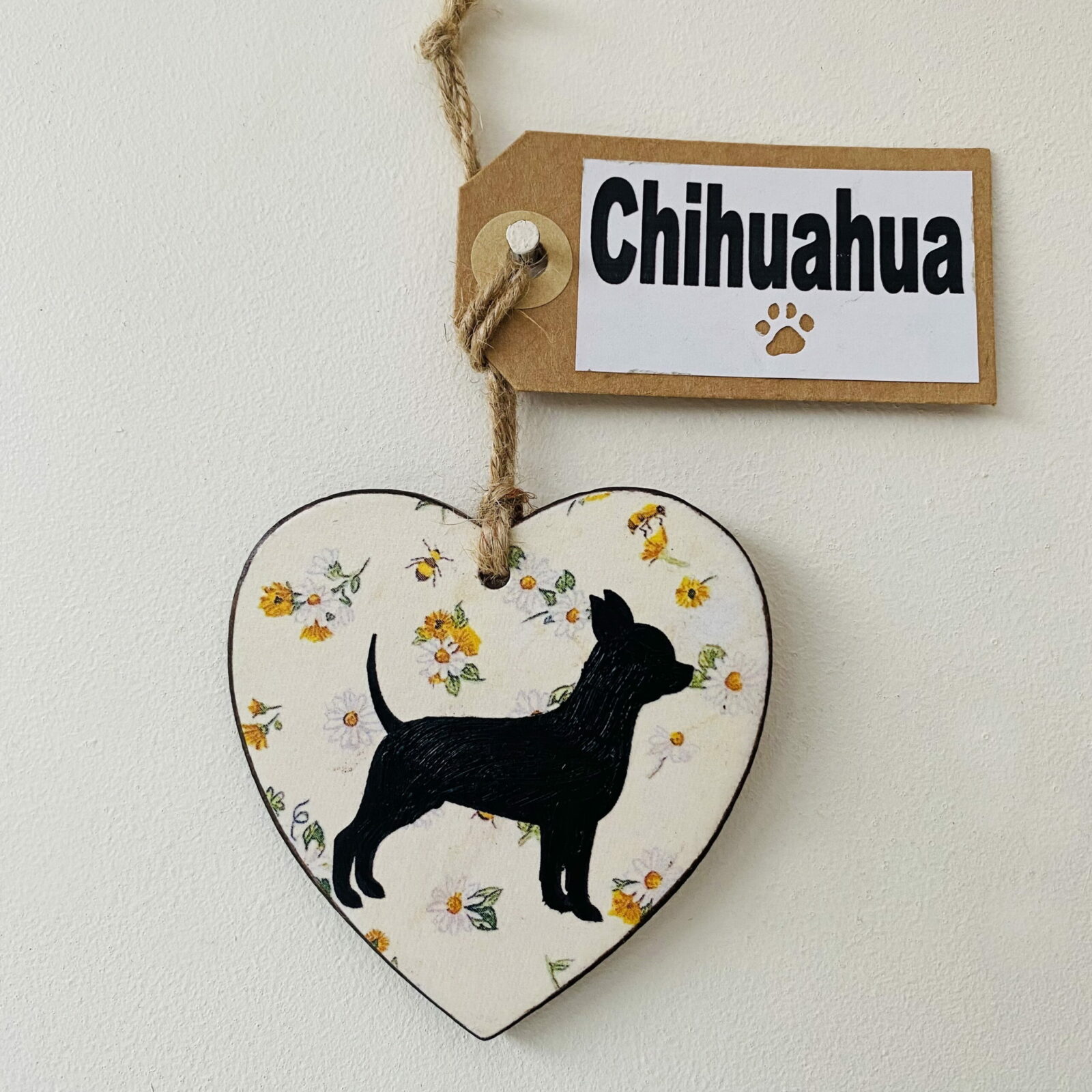Beautifully finished, with an acrylic painted Chihuahua on a floral and bee background. A hand made Kraft card tag, detailing the dog breed compliments the design.