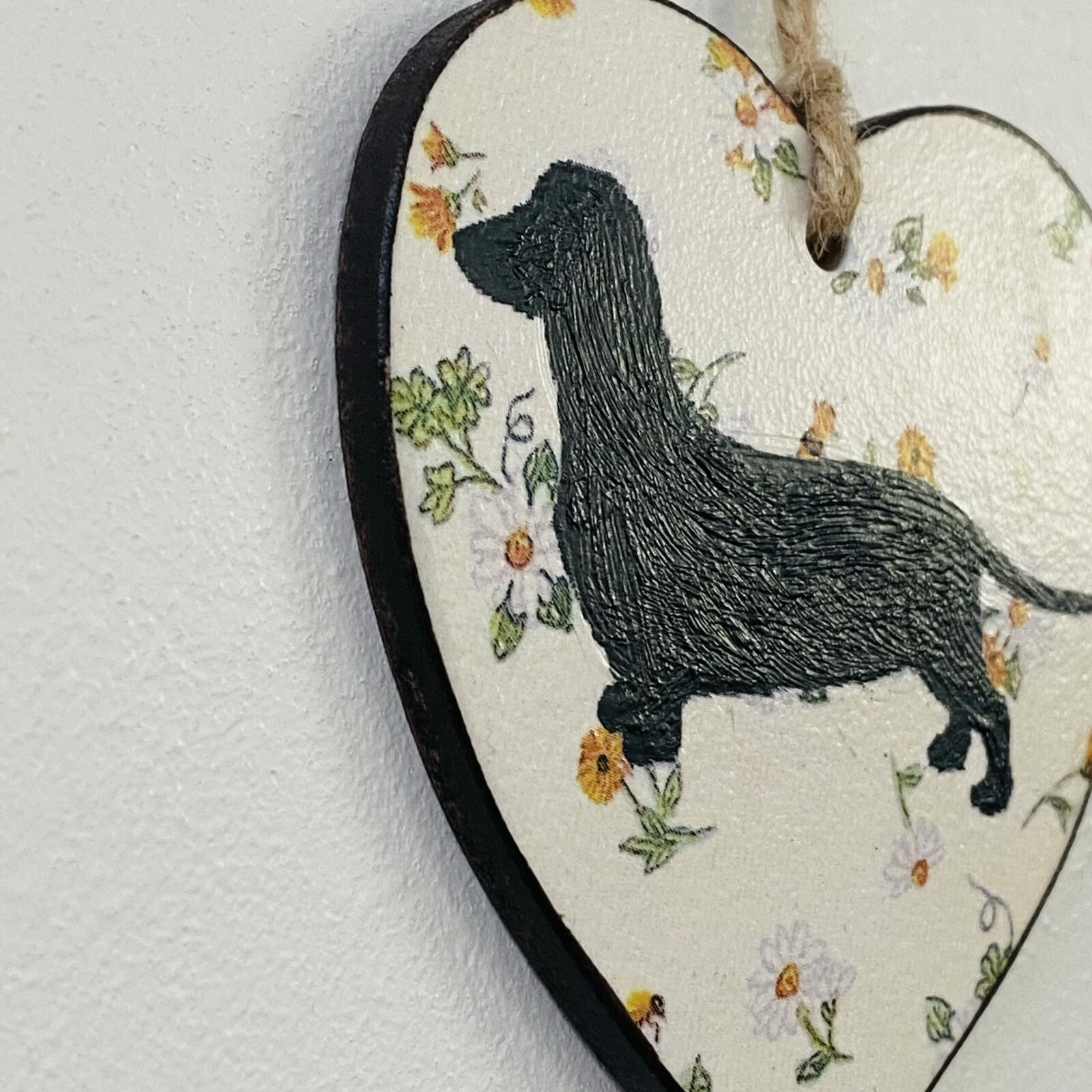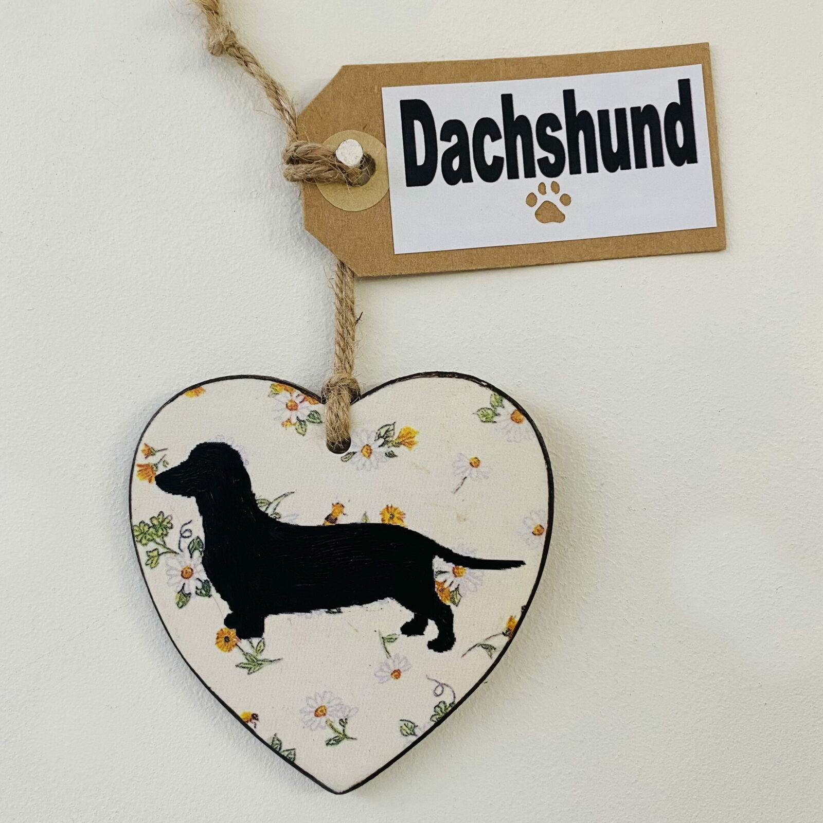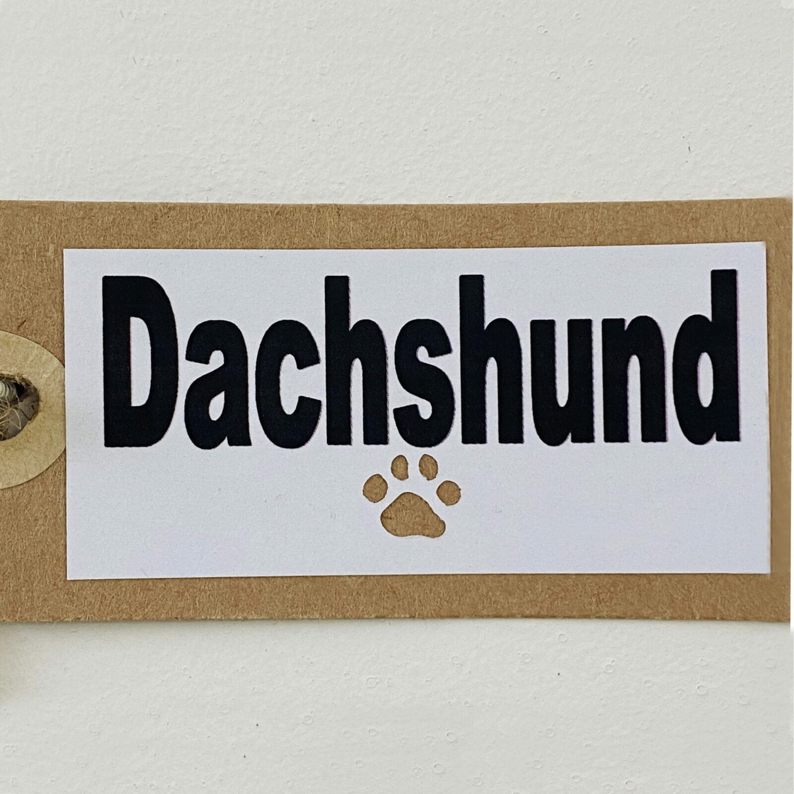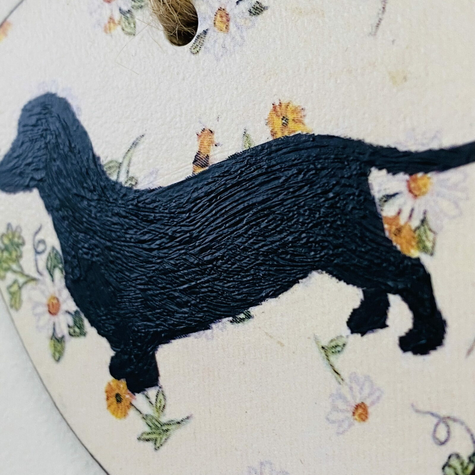 Beautifully finished, with an acrylic painted Dachshund on a floral and bee background. A hand made Kraft card tag, detailing the dog breed compliments the design.