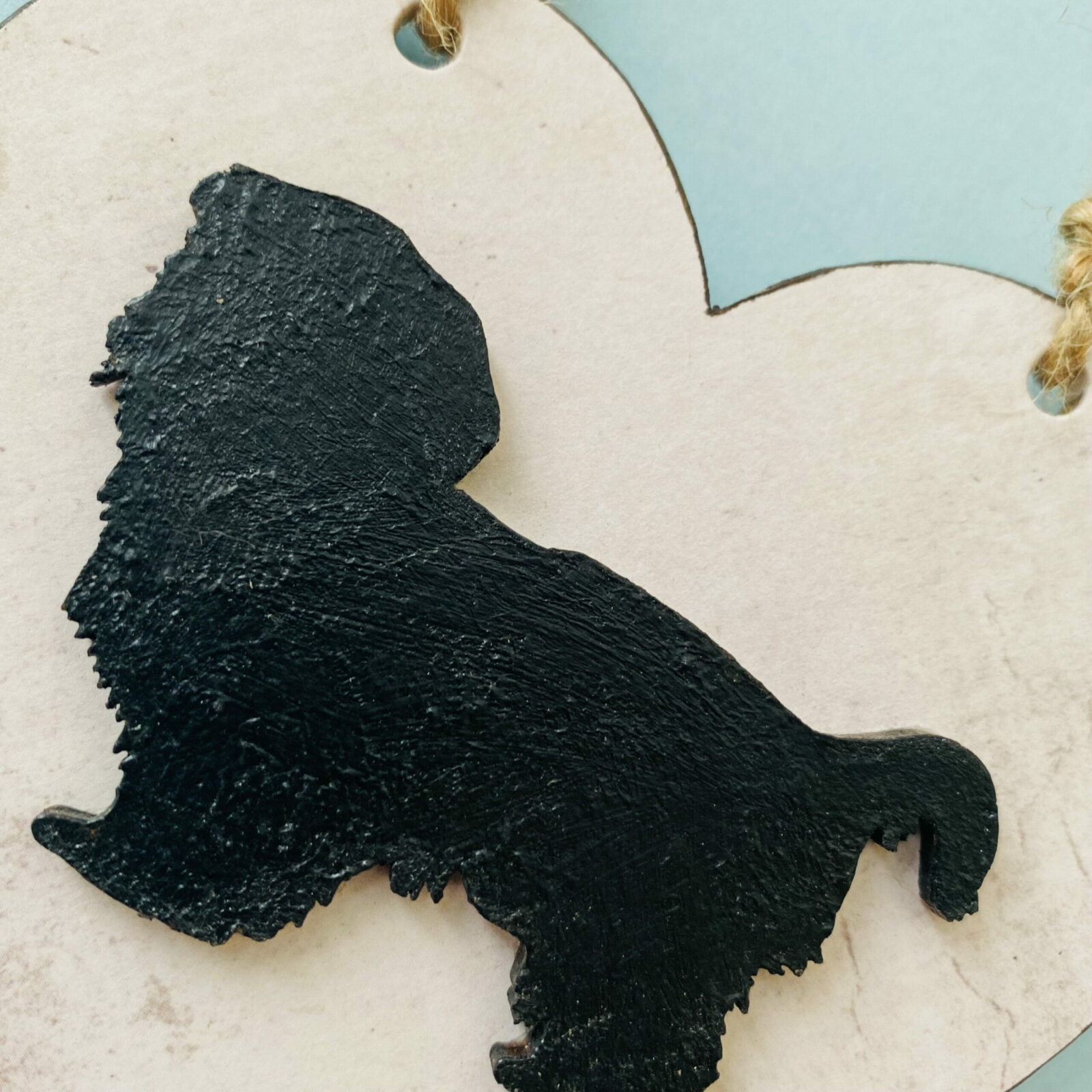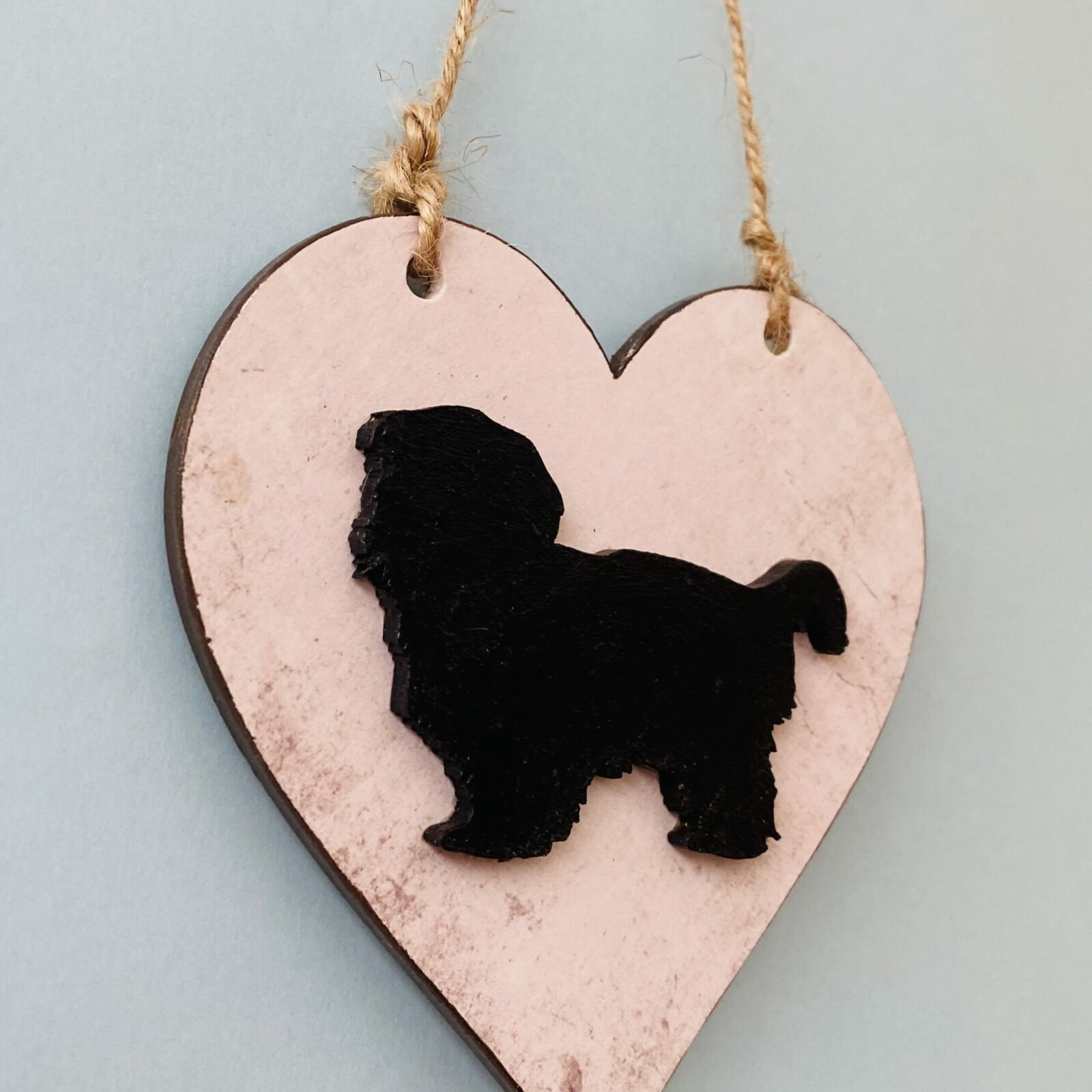 The heart has been decoupaged with a vintage print design, beautifully finished, with a wooden Shih Tzu, which has been painted with black acrylic paint, and added to the background.