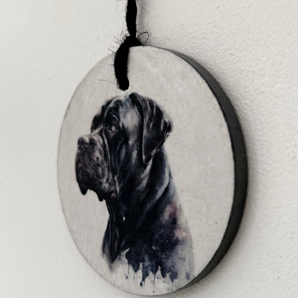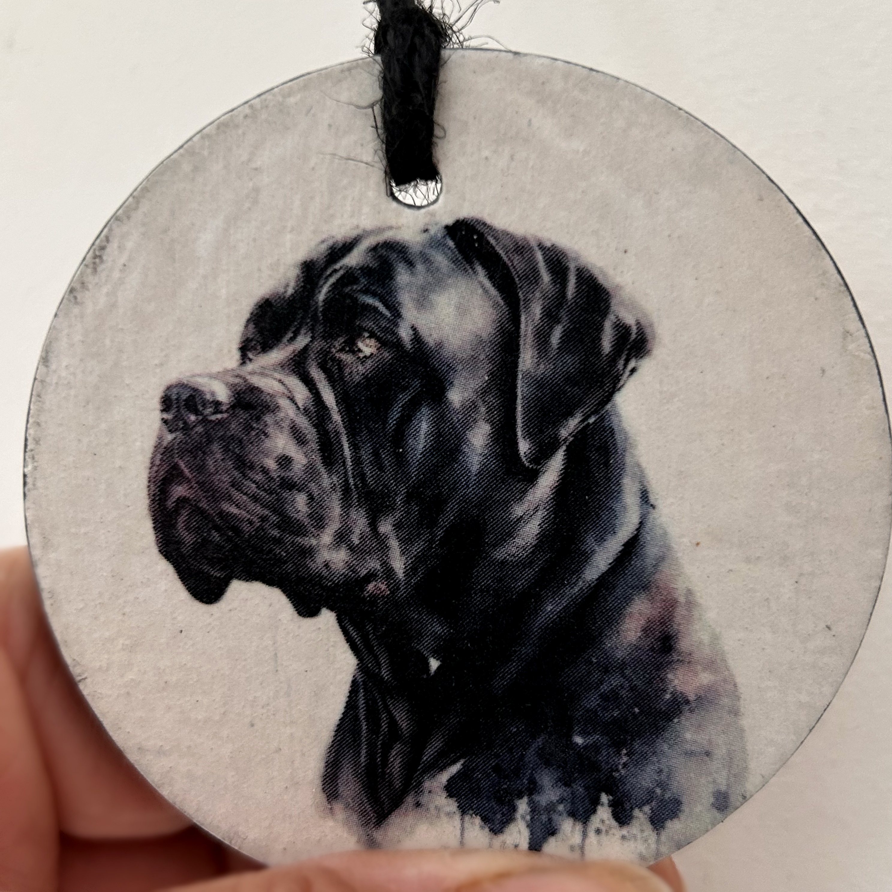 This is a beautiful slate circle, which has been painted with a pale cream chalk paint and decorated with a water colour paint effect Cane Corso.